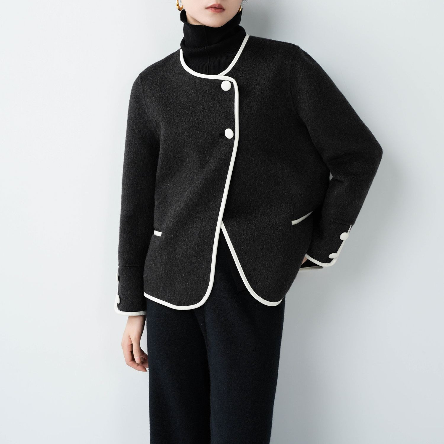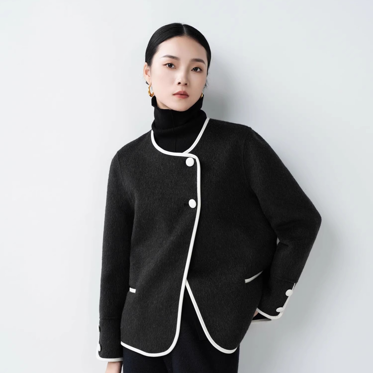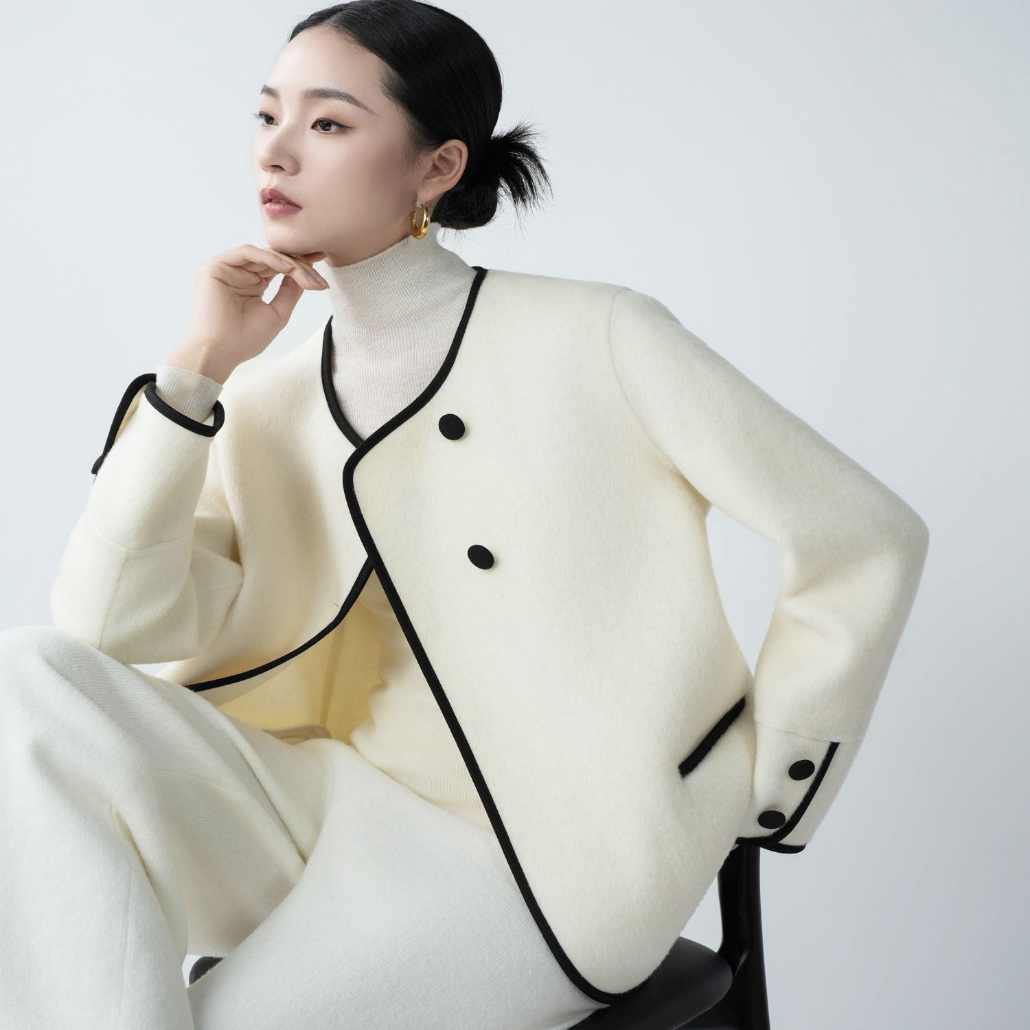 秋季纯色奶糯白客供面料简约小香风撞色包边女羊毛双面毛呢外套