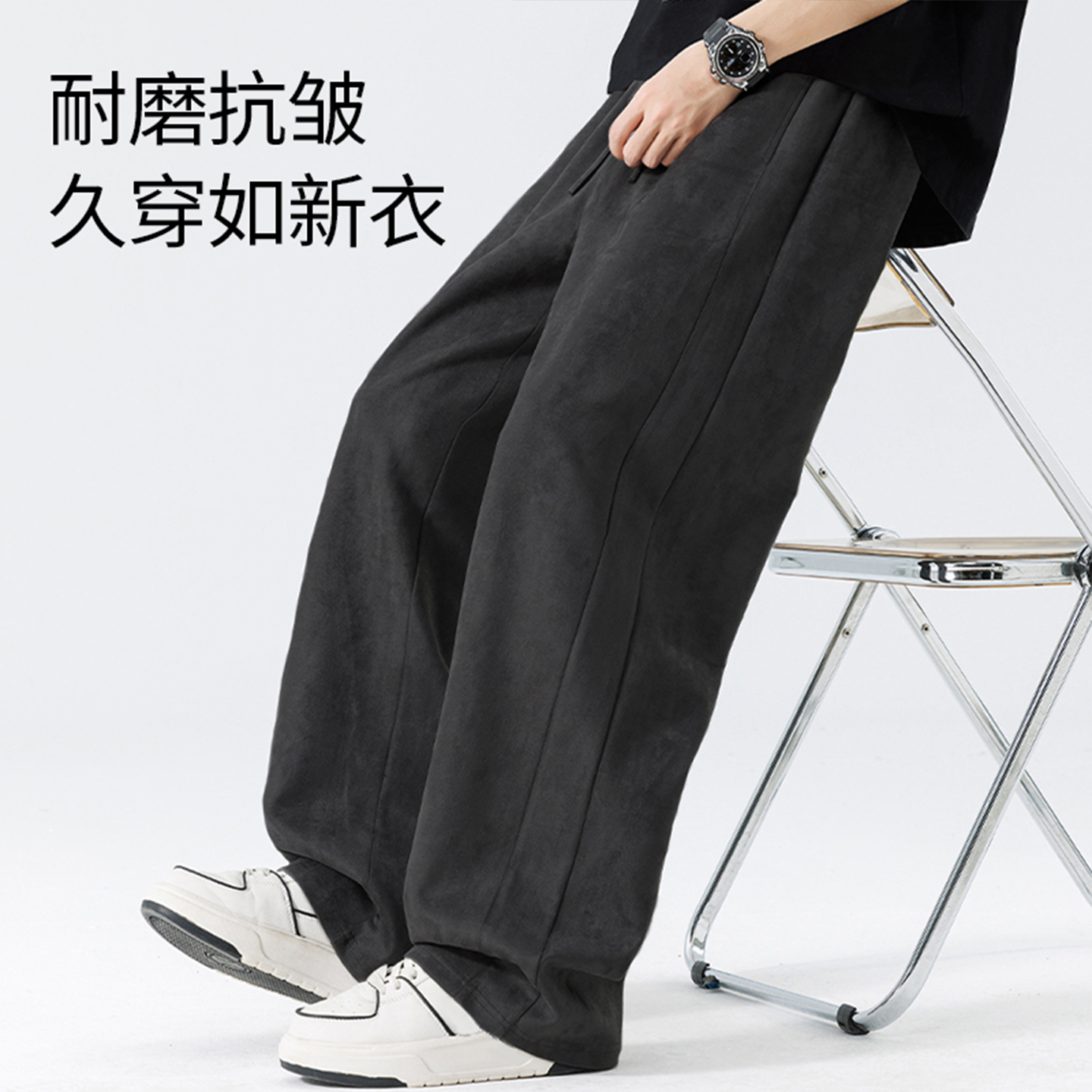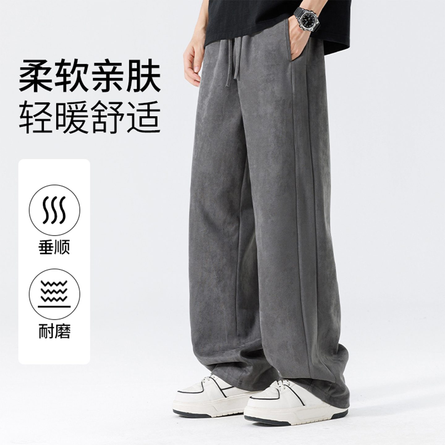 班尼路阔腿长裤男美式麂皮绒休闲直筒卫裤男生宽松秋季大码裤子LF