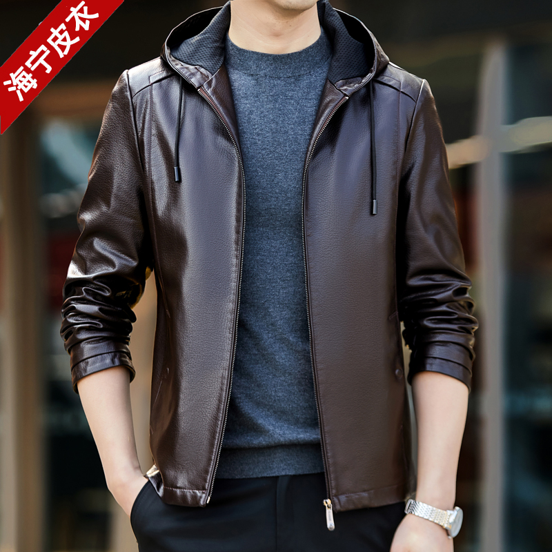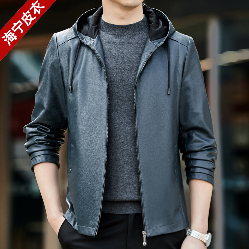 春秋新款海宁高端真皮皮衣男连帽休闲外套中青年男装绵羊皮夹克潮