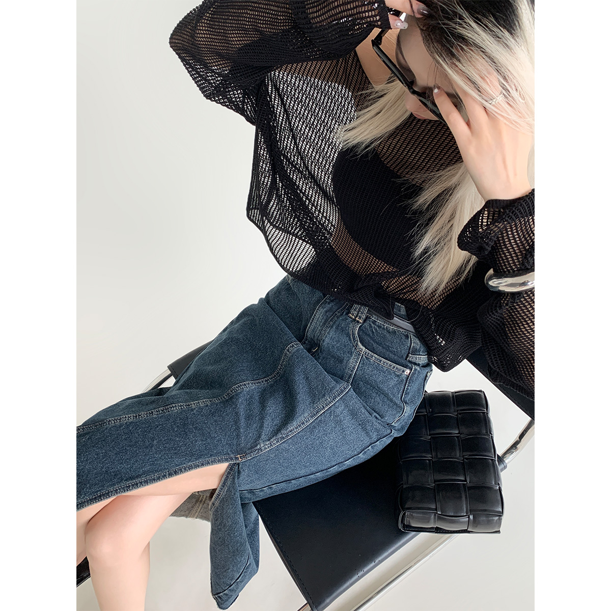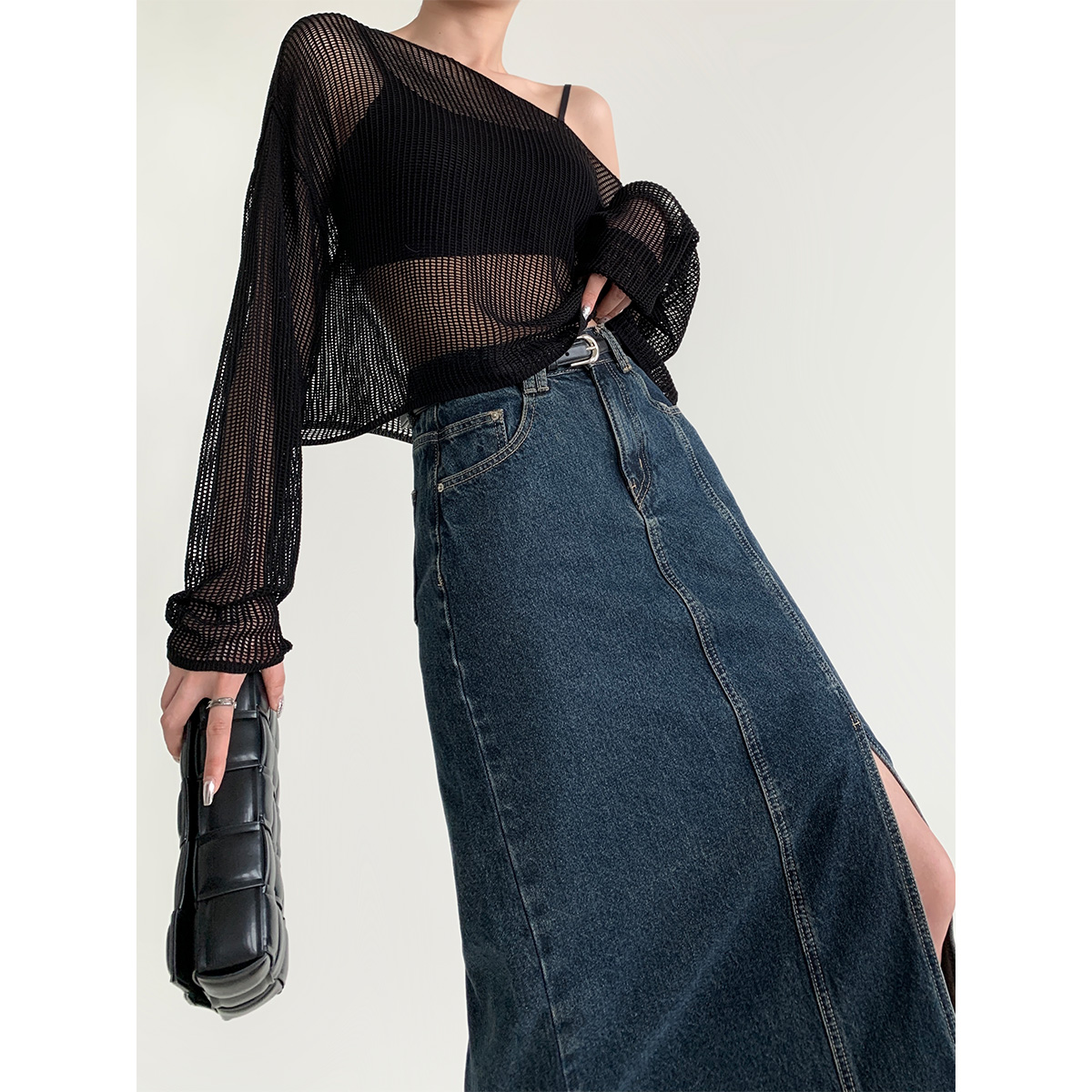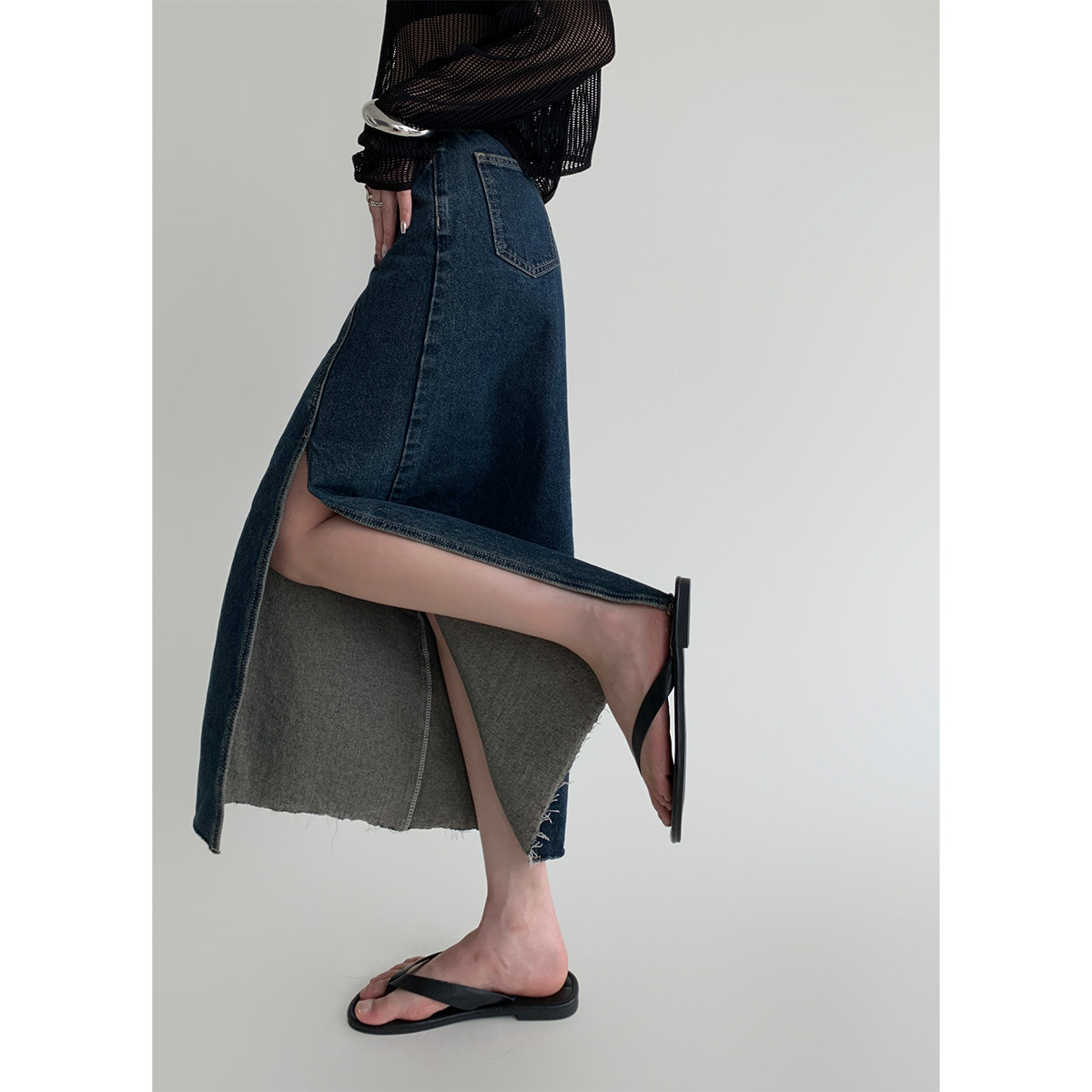 PAPERLLL辛间 辣妹牛仔 复古前开衩A字半身裙做旧毛边牛仔长裙女