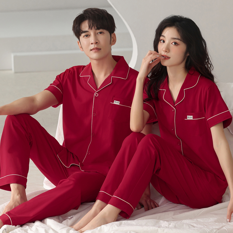 情侣睡衣女夏季纯棉短袖长裤本命年红色新婚男士薄款家居服套装夏