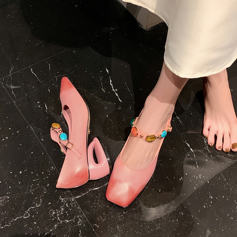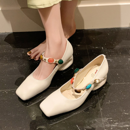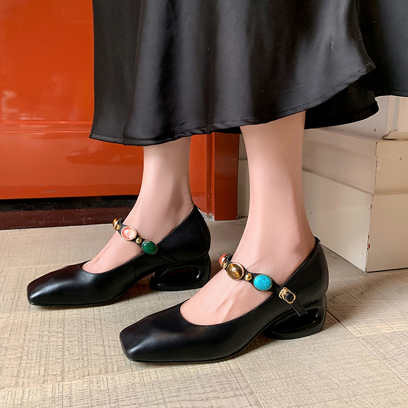 粗跟配裙子巨好看宝石玛丽珍单鞋