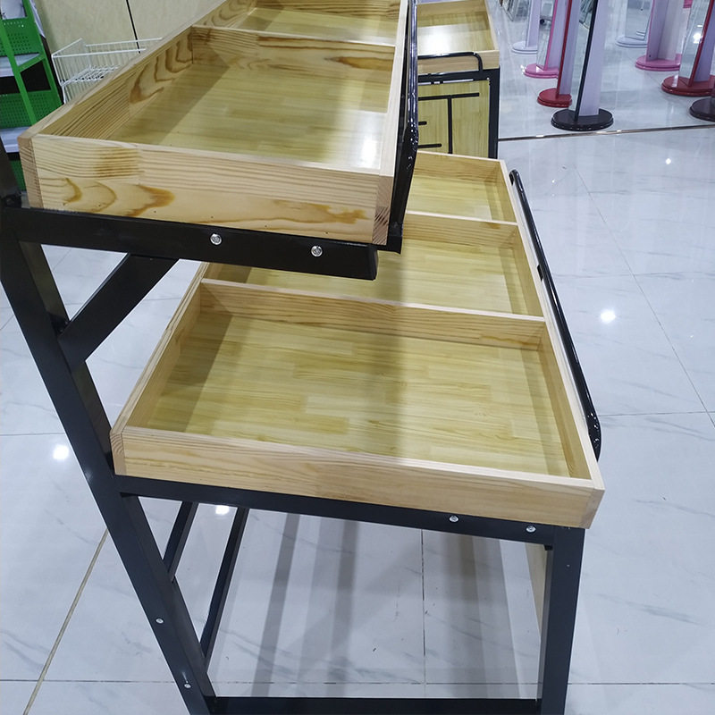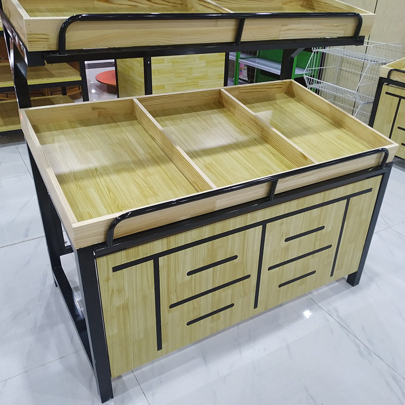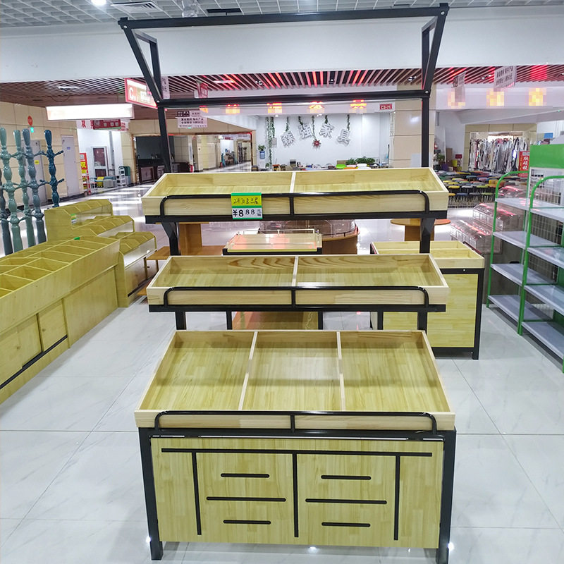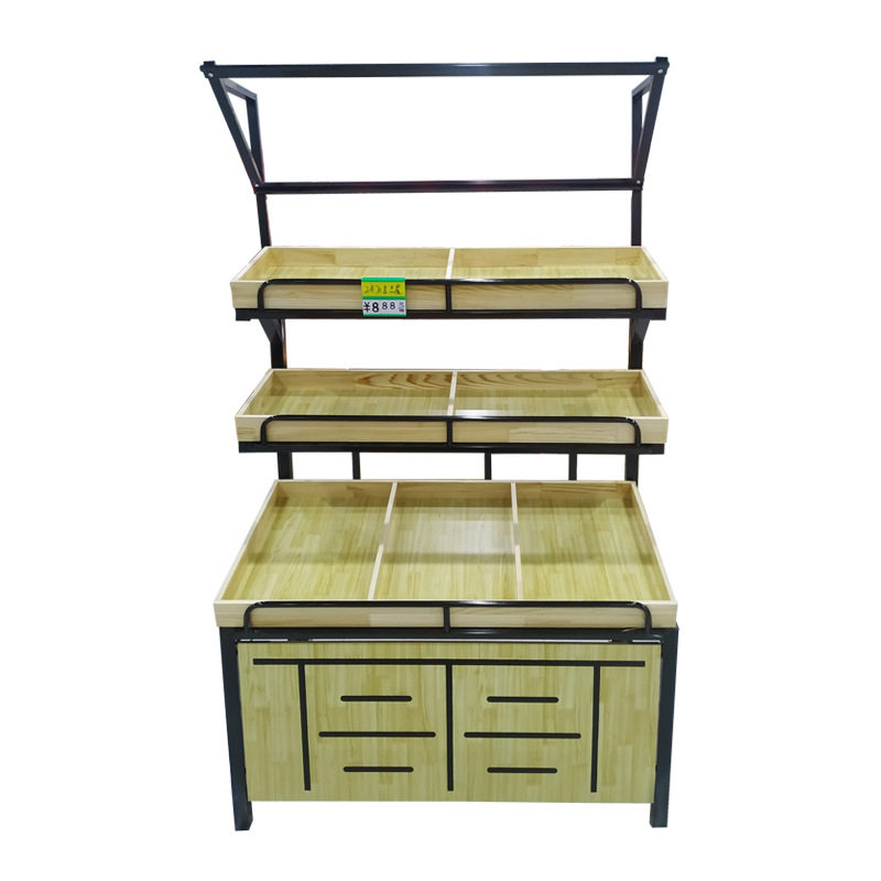 超市货架 三层木质展示柜金属边框架蔬菜展示架 便利店果蔬货架