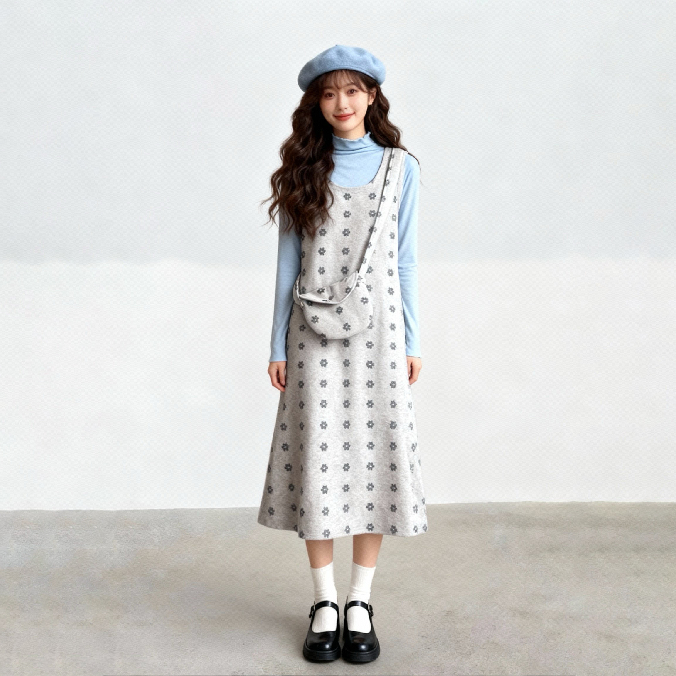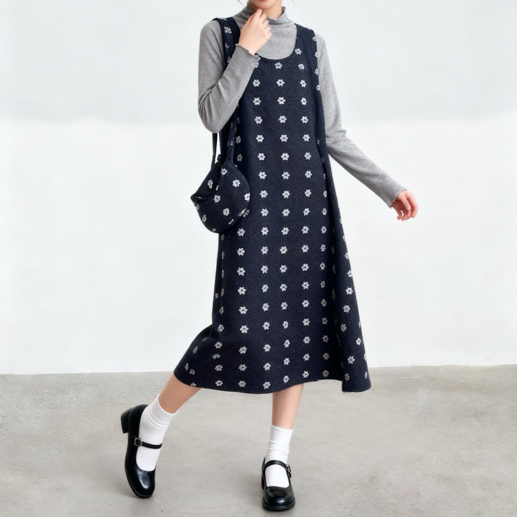 120斤的大杨 胖mm复古花朵撞色连衣裙秋冬遮肉A字毛呢长裙背心裙