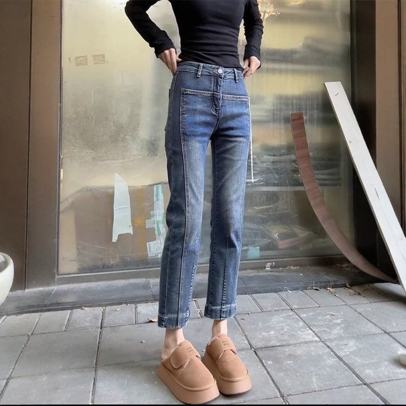 大码百搭高腰弹力显瘦直筒牛仔裤春季新款设计感洋气九分烟管裤子