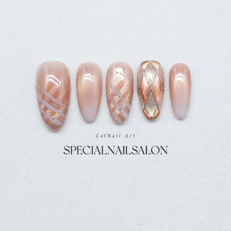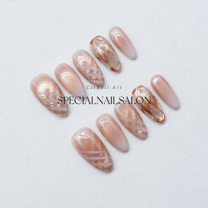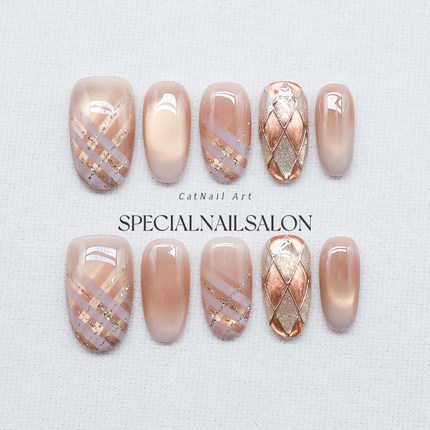 【英伦午后】纯手工穿戴甲菱格猫眼秋冬高级感焦糖色显白美甲贴片