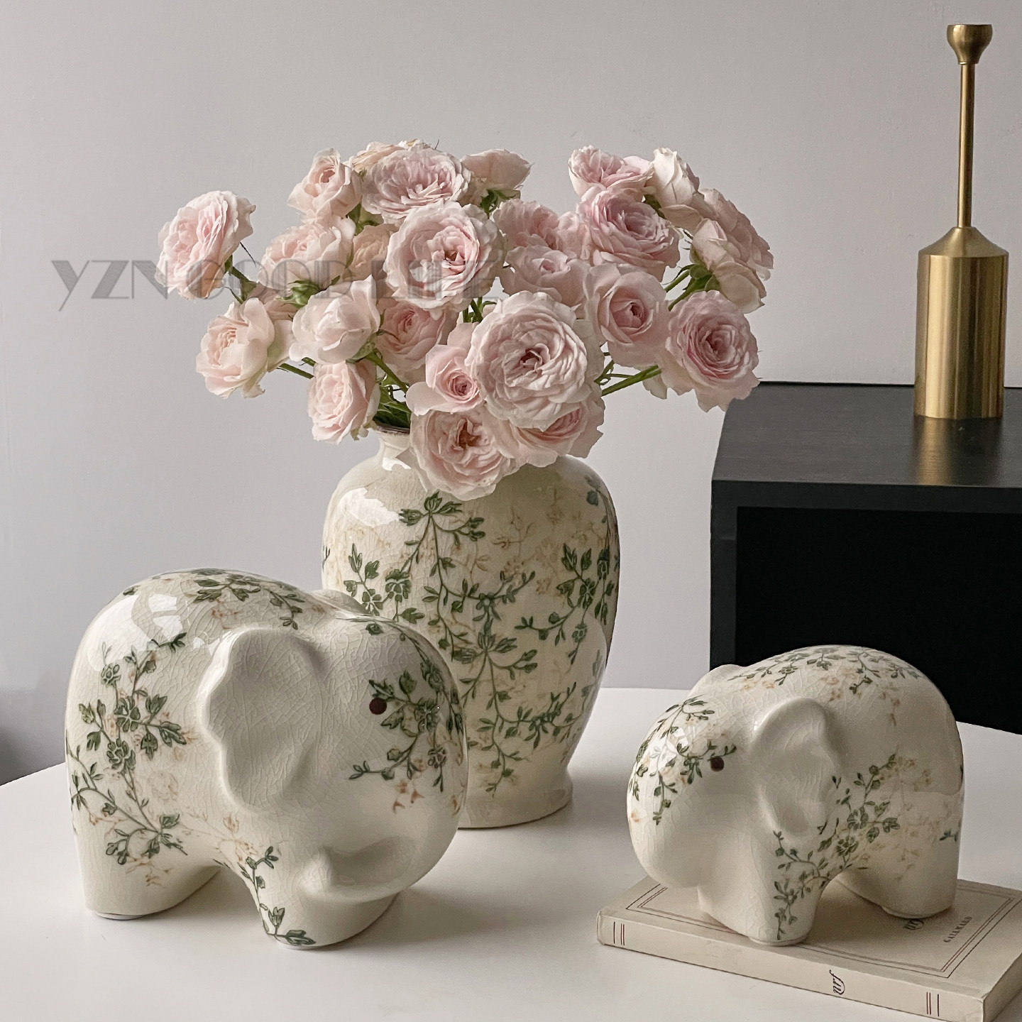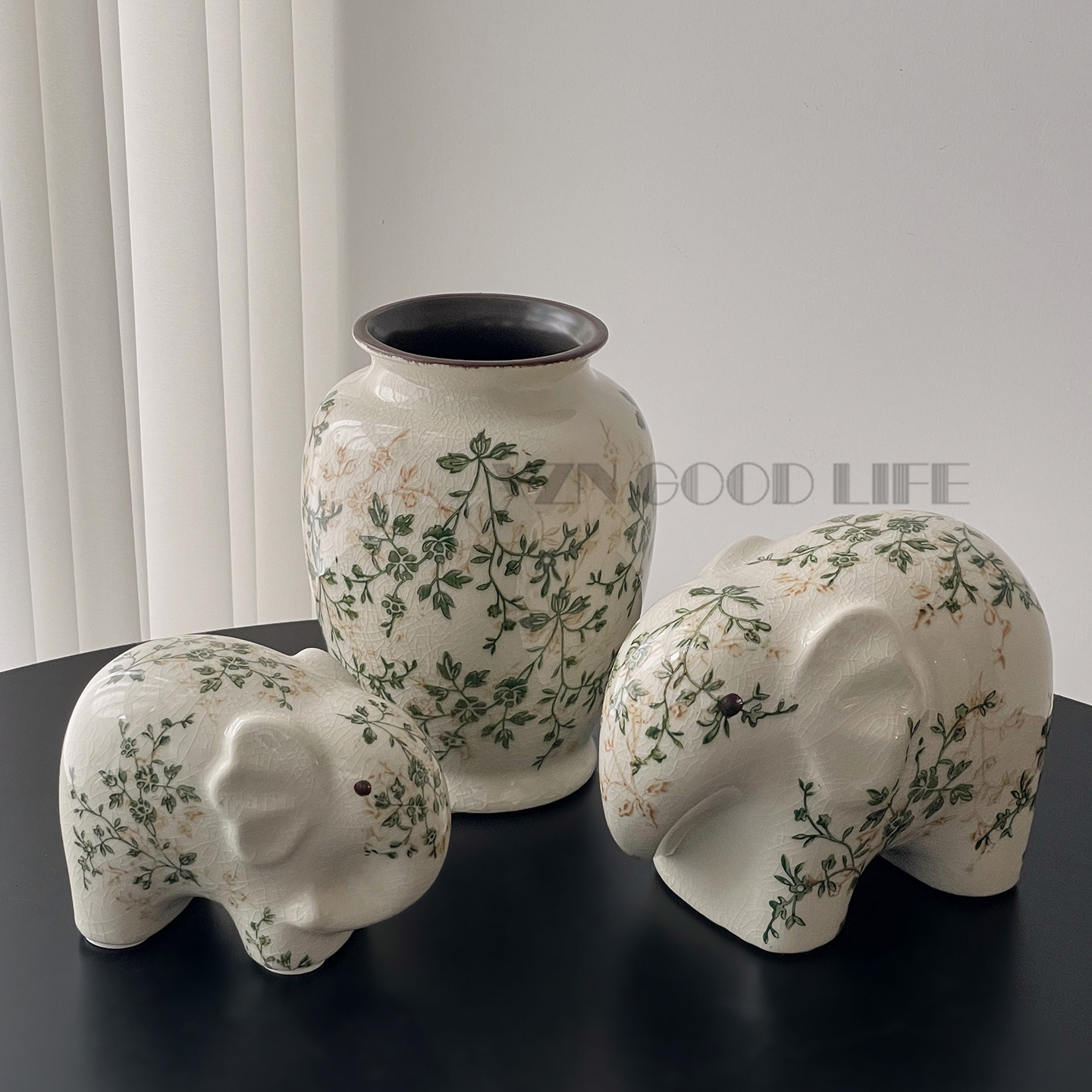 家居复古装饰品陶瓷大象一对摆件电视柜酒柜客厅繁花裂纹釉工艺品