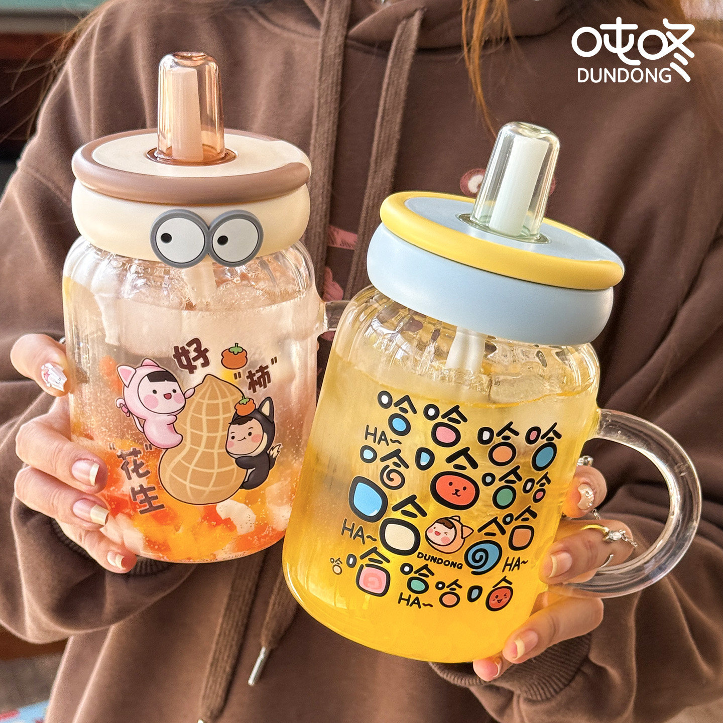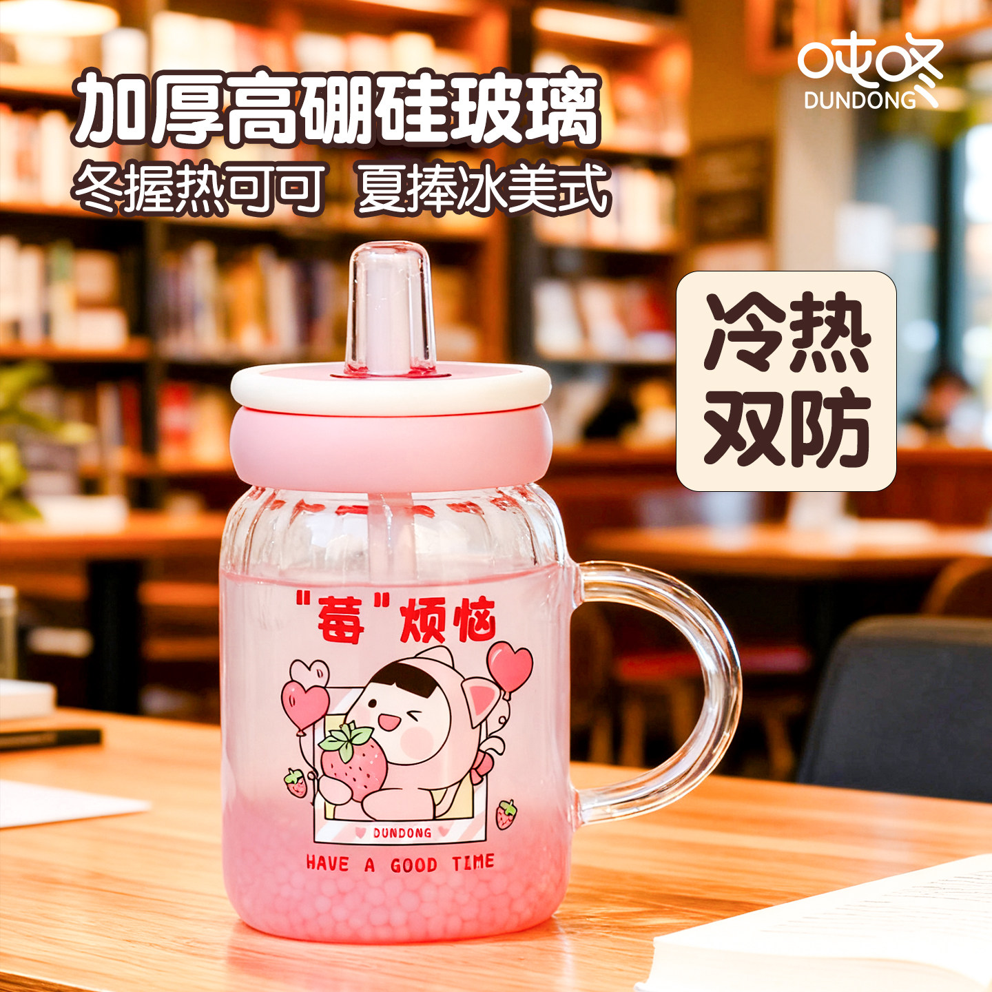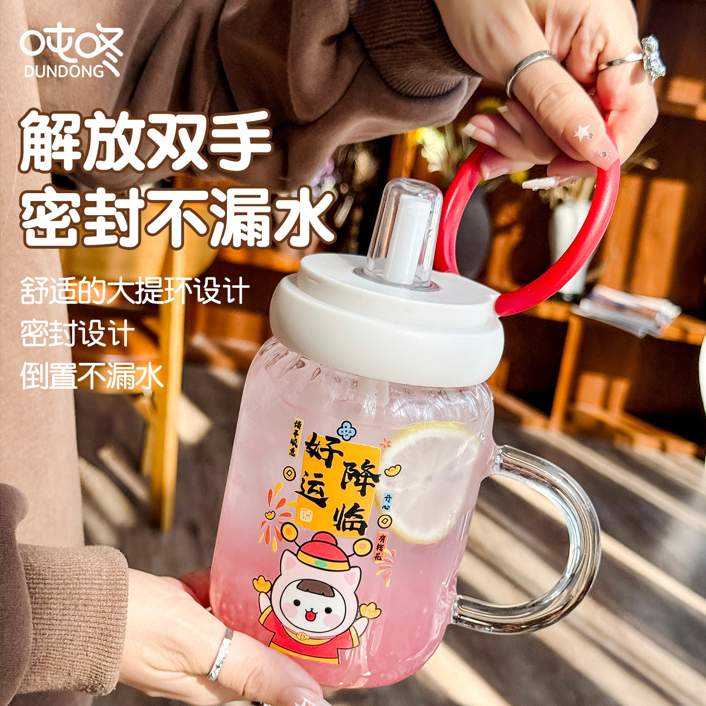 吨咚耐高温玻璃带把手加粗吸管杯