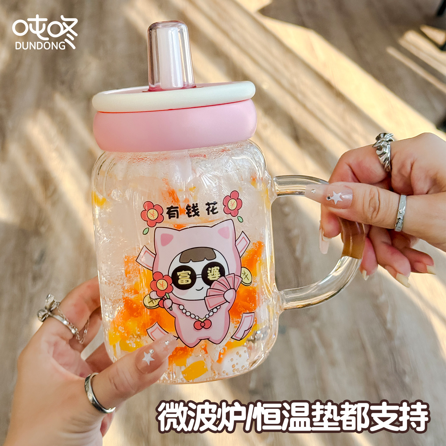 吨咚吸管玻璃杯带把手桌面杯特别好看杯子马克杯水杯新款女花茶杯