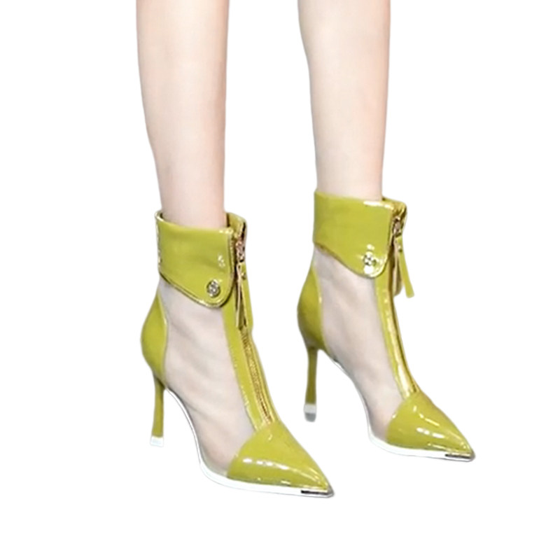 性感镂空网靴前拉链网纱尖头细跟短靴女2025春夏新款漆皮高跟凉靴