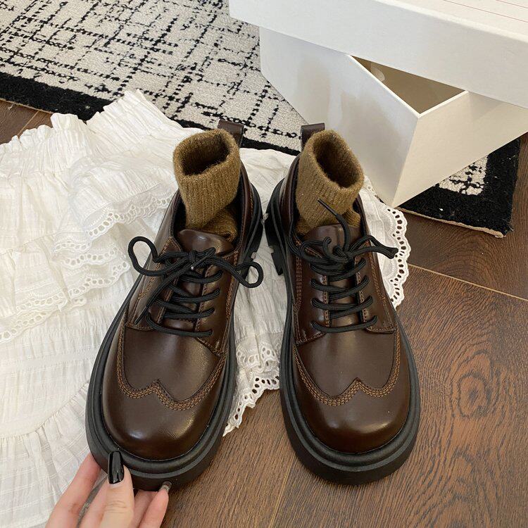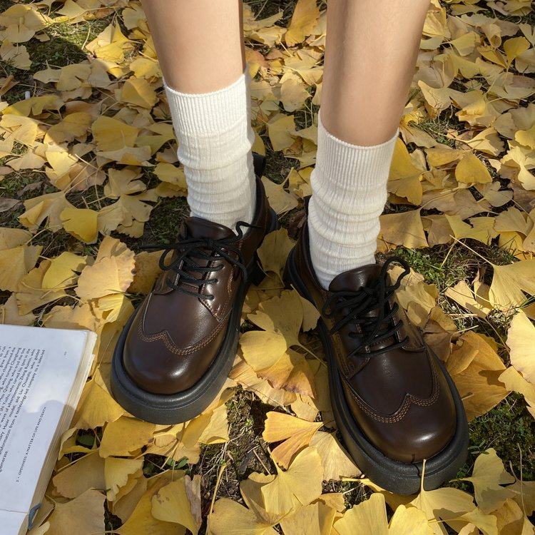 英伦风布洛克小皮鞋女百搭复古圆头系带黑色单鞋棕色厚底jk乐福鞋
