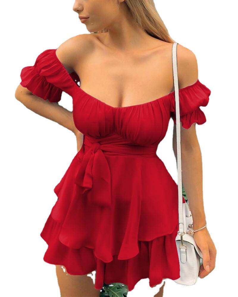 Birthday party dress一字肩荷叶边低胸性感系带收腰短款连衣裙女