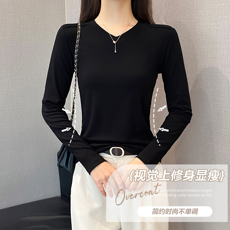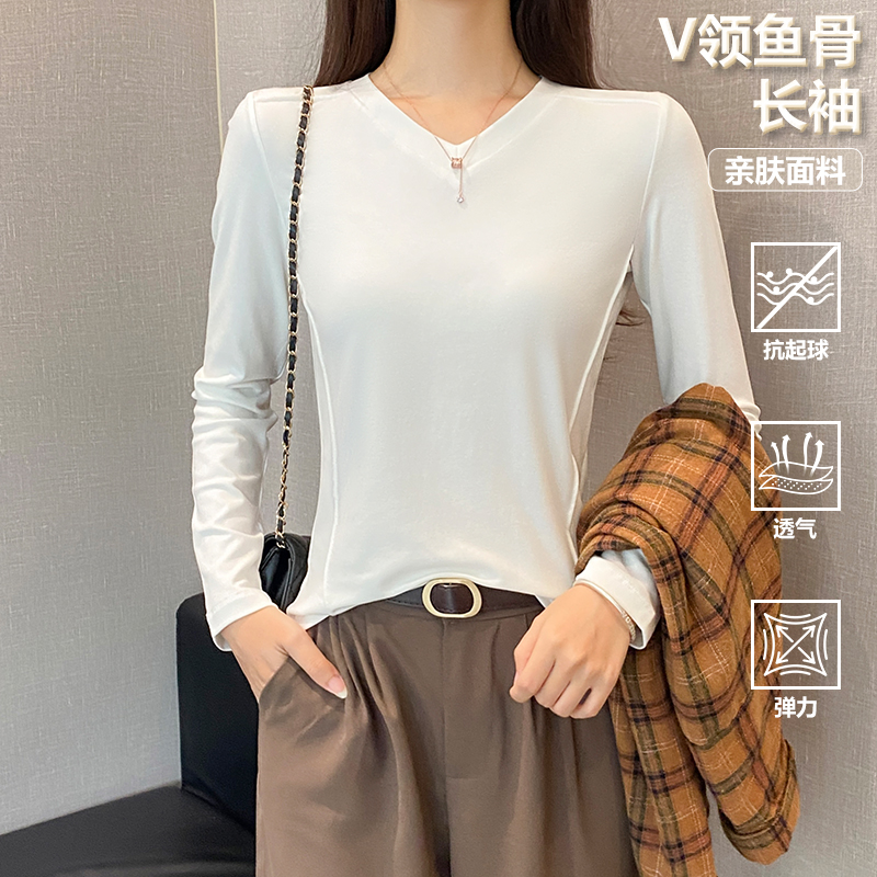 白色V领鱼骨正肩长袖t恤女2025新款春秋修身打底衫百搭显瘦上衣潮