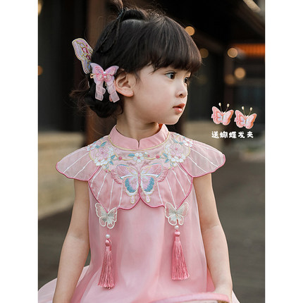 幼悠女童汉服连衣裙2025夏新款中国风刺绣流苏丝缎宝宝网纱背心裙