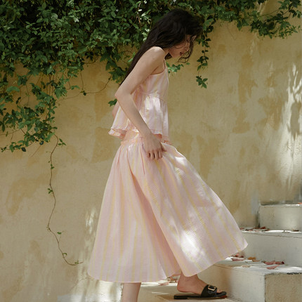 LLANO条纹碎褶大摆半身裙复古浪漫慵懒度假棉质半裙小a裙子女夏季
