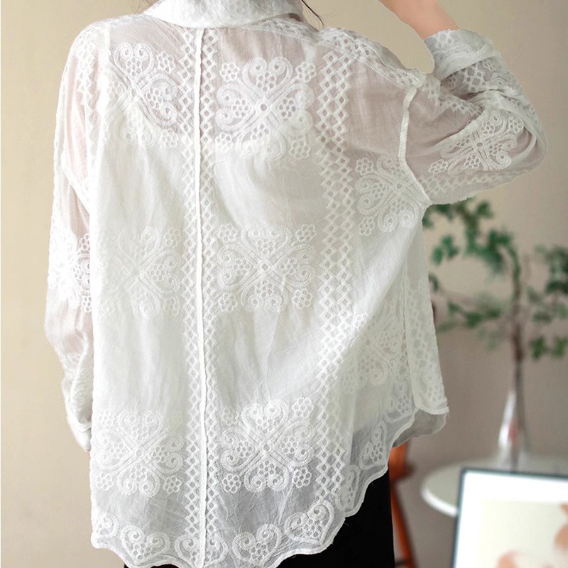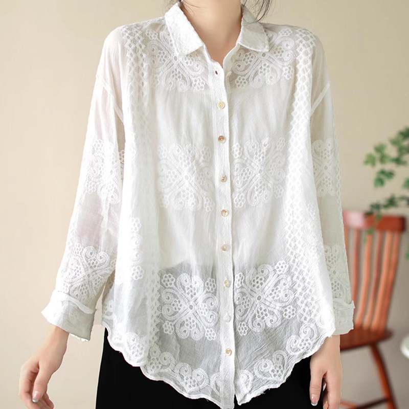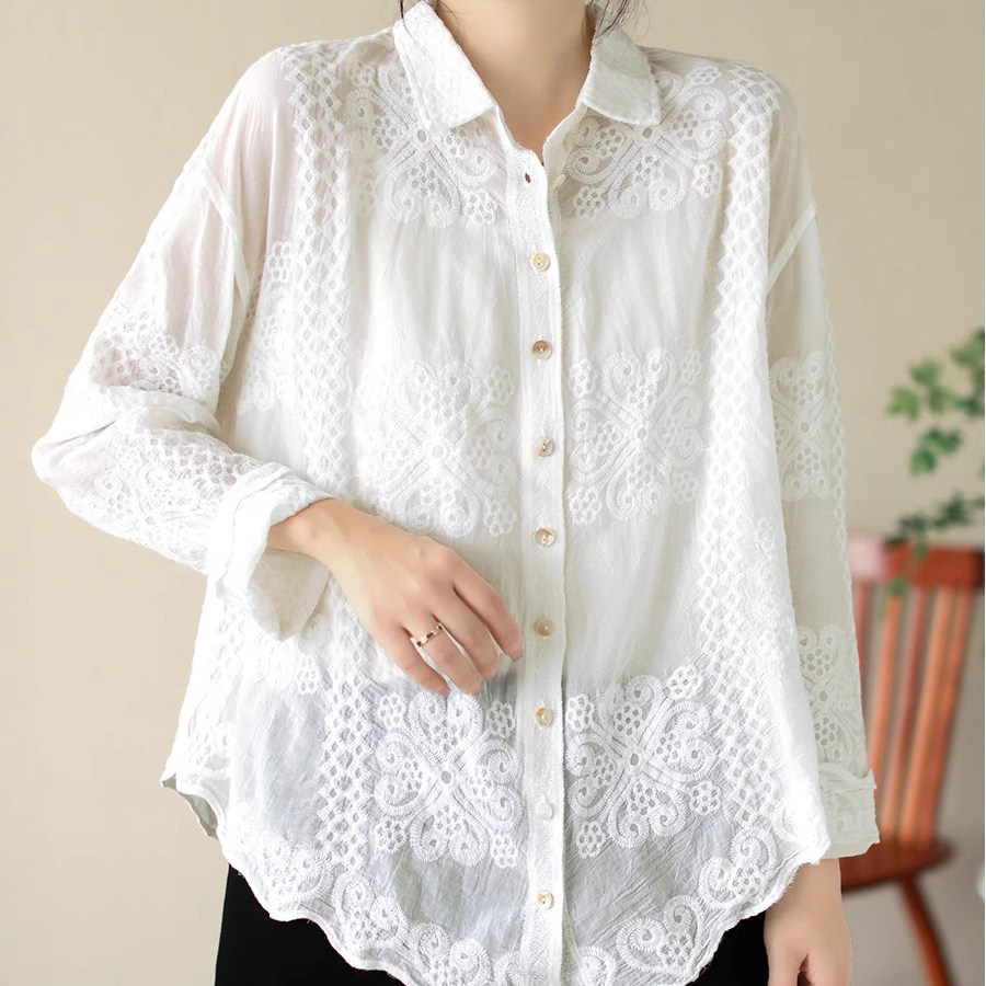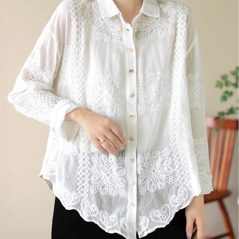 纯色宽松衬衫女春季复古翻领针织刺绣女士衬衣休闲百搭长袖上衣潮