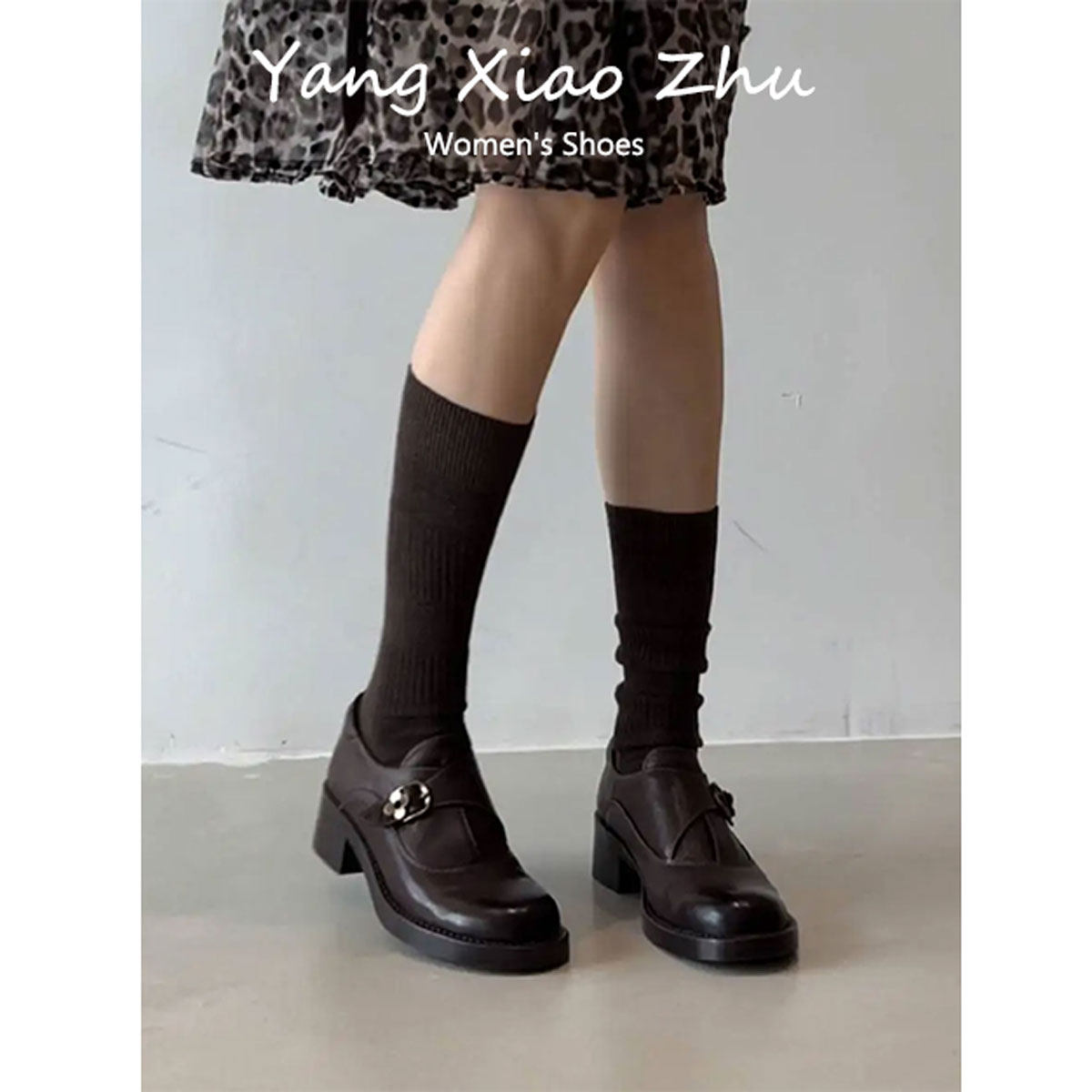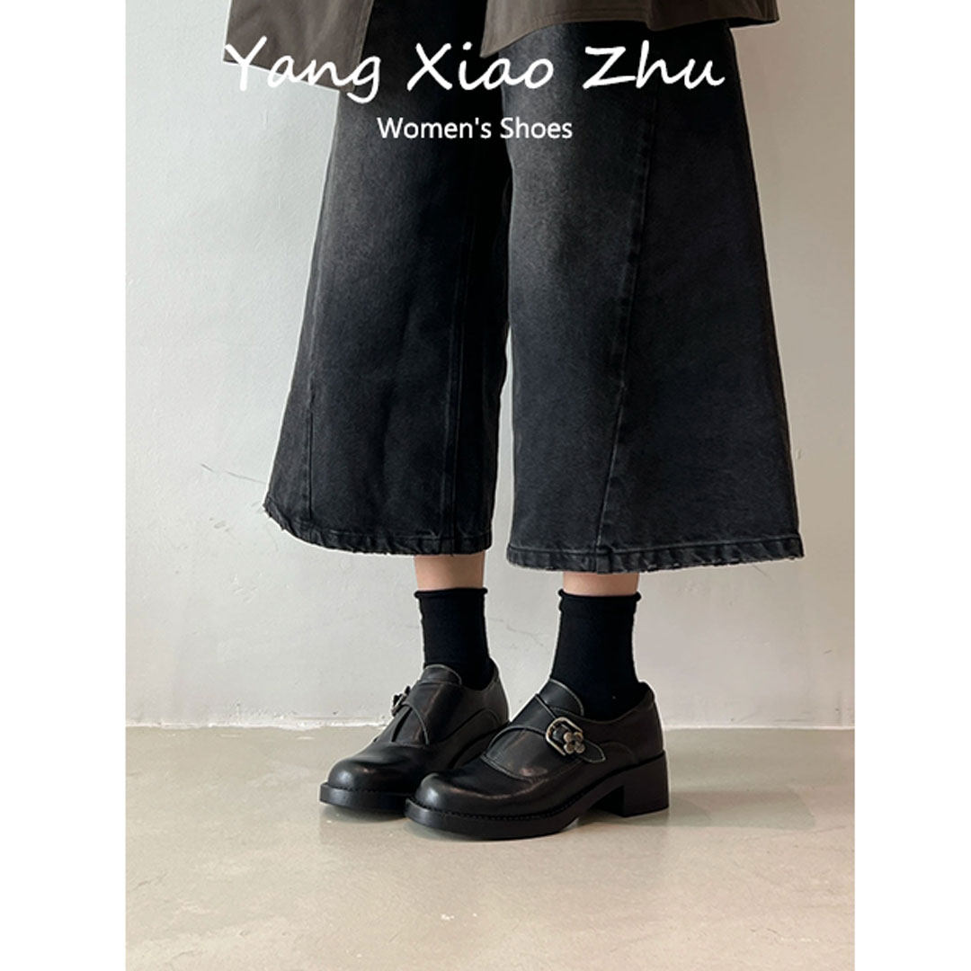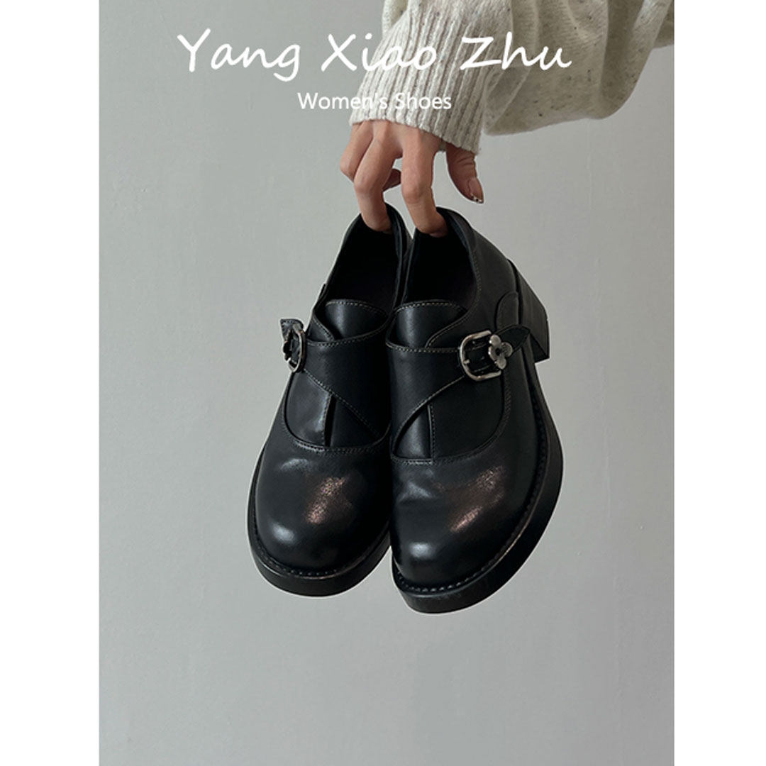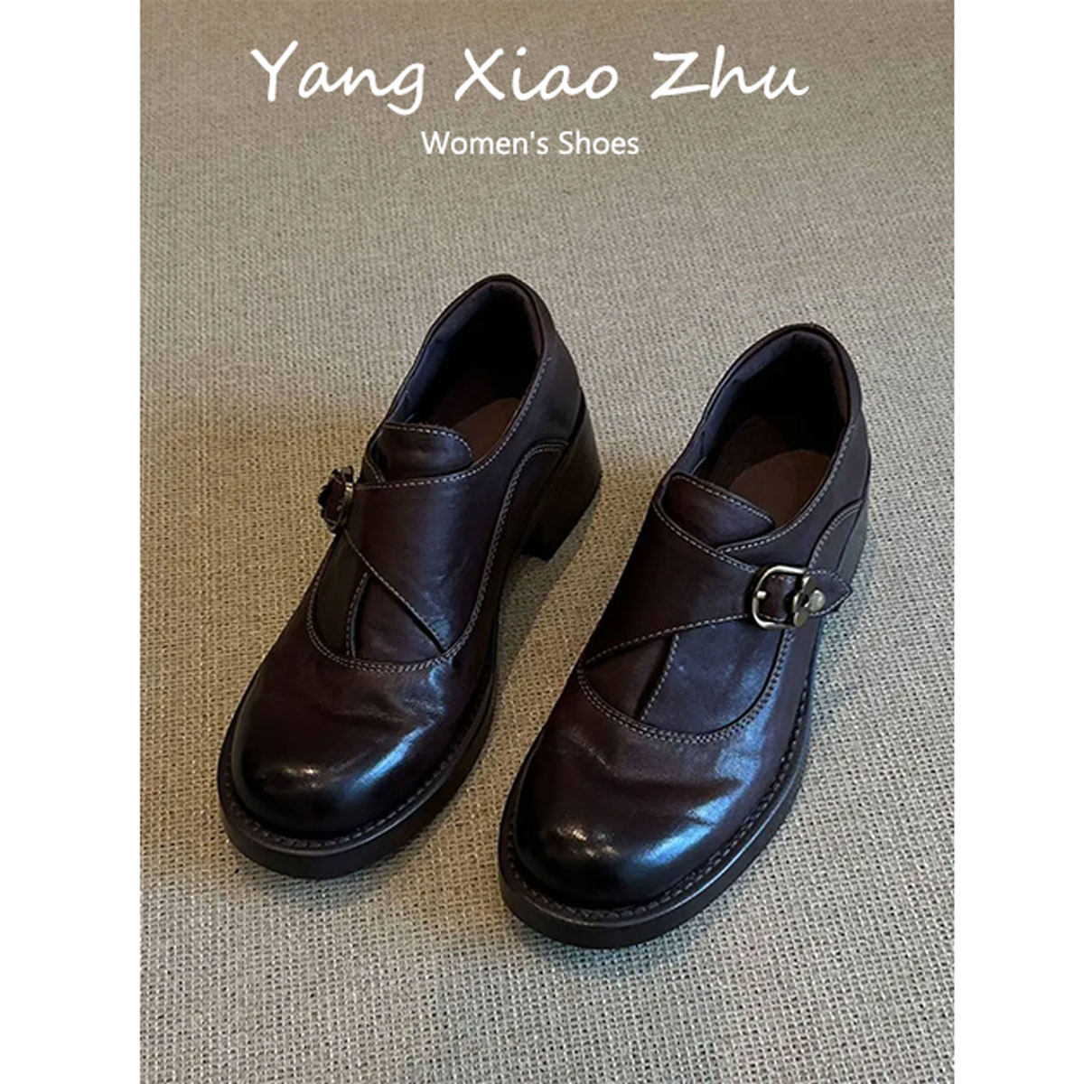羊皮版~复古皮带扣粗跟乐福单鞋2025新款百搭英伦风圆头小皮鞋女