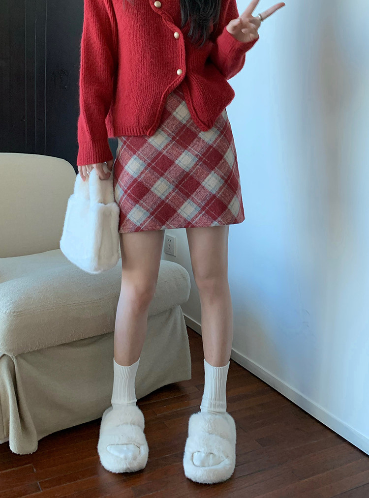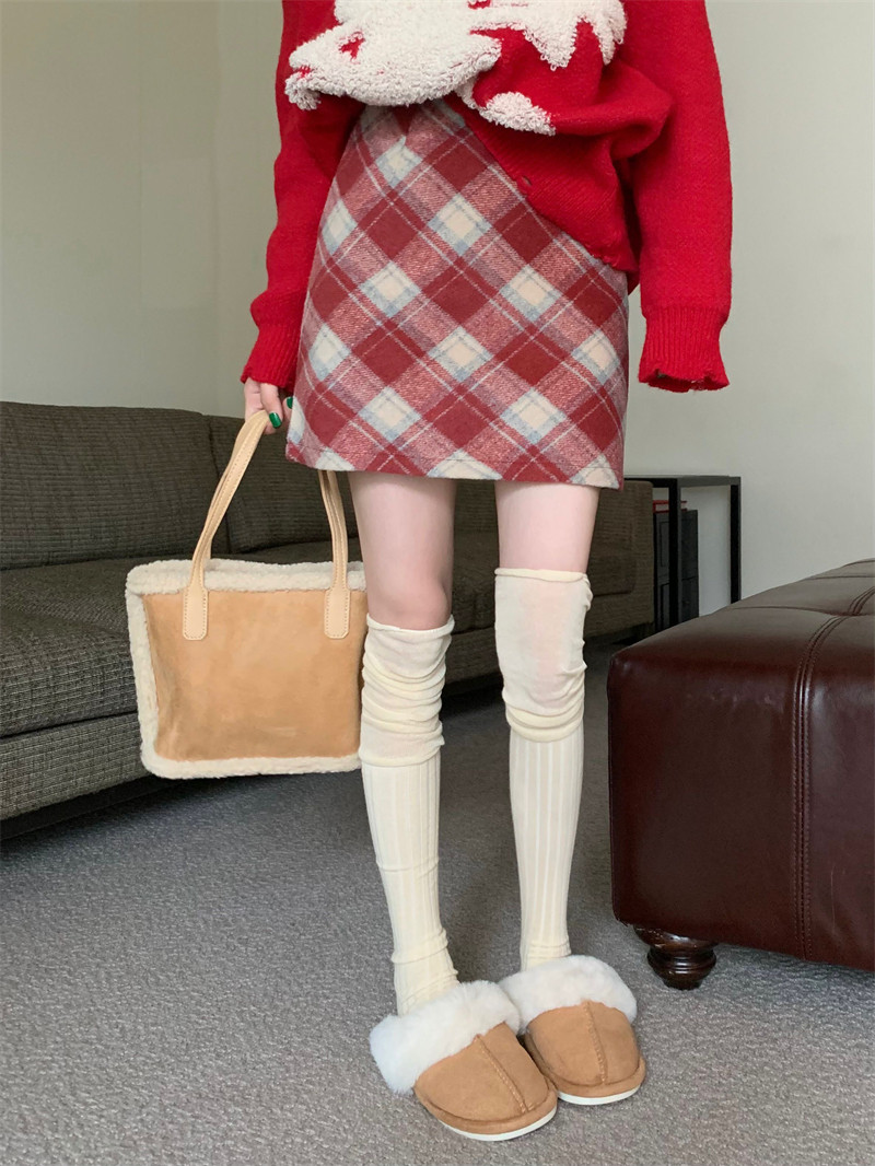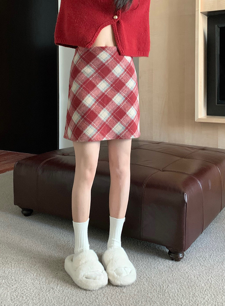圣诞红色格子毛呢半身裙女秋冬半裙小个子短裙包裙高腰a字包臀裙