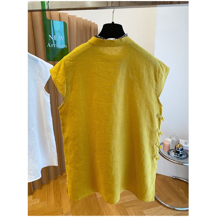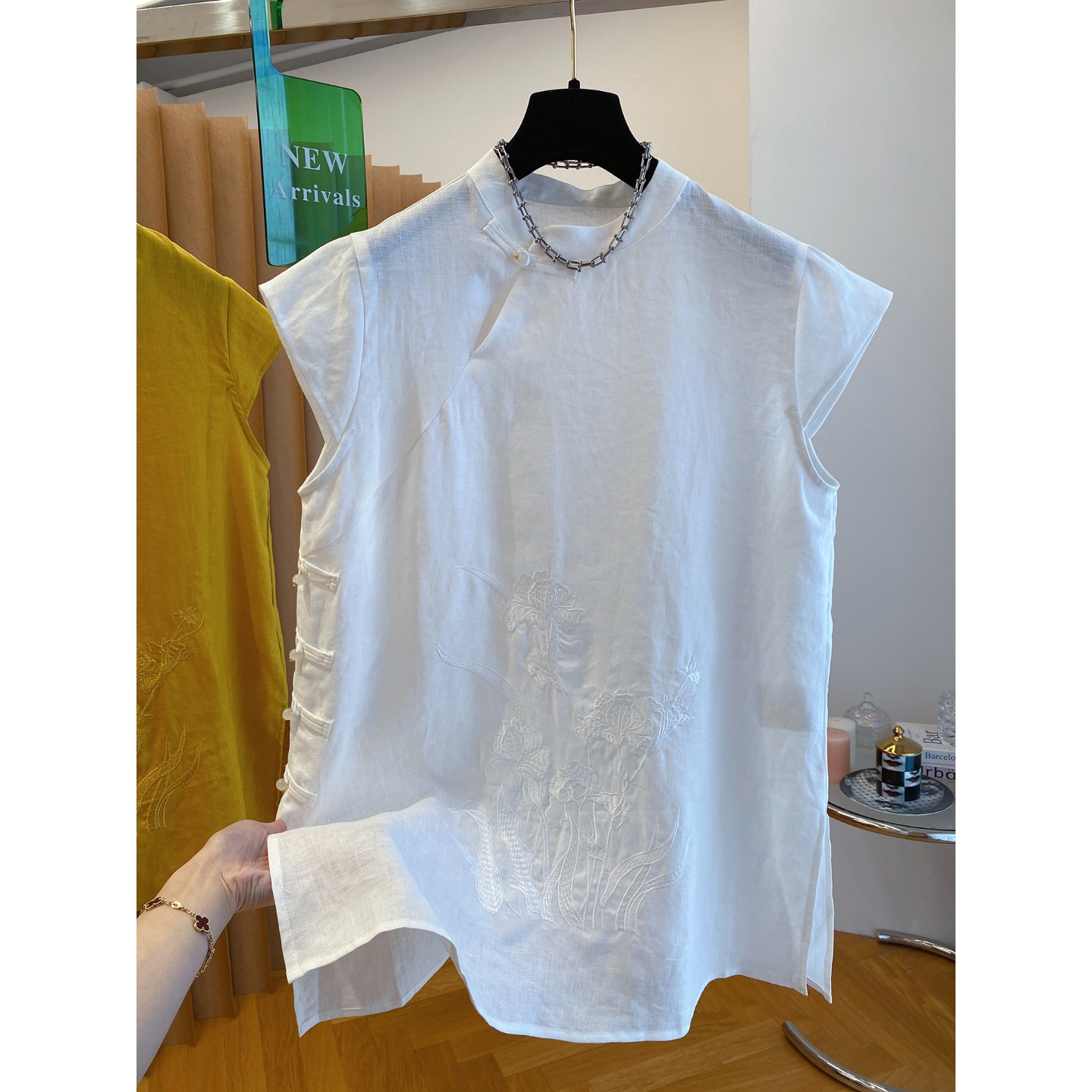 新中式盘扣国风刺绣苎麻背心衬衫女夏季宽松独特小飞袖亚麻上衣潮