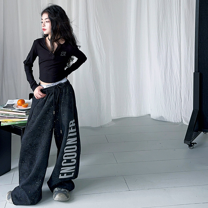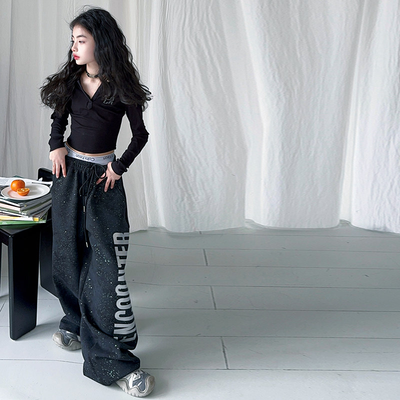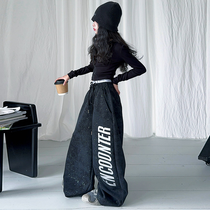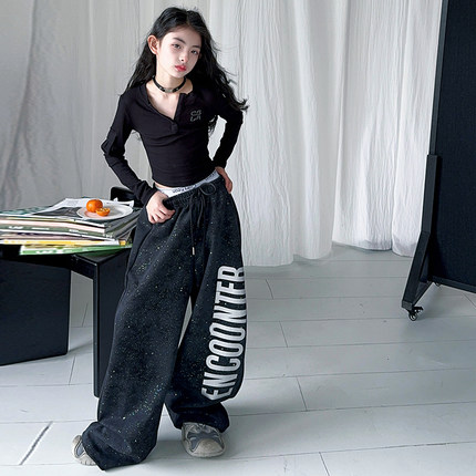 女童街舞演出服2025潮酷时髦长袖上衣阔腿裤套装黑色潮牌走秀服