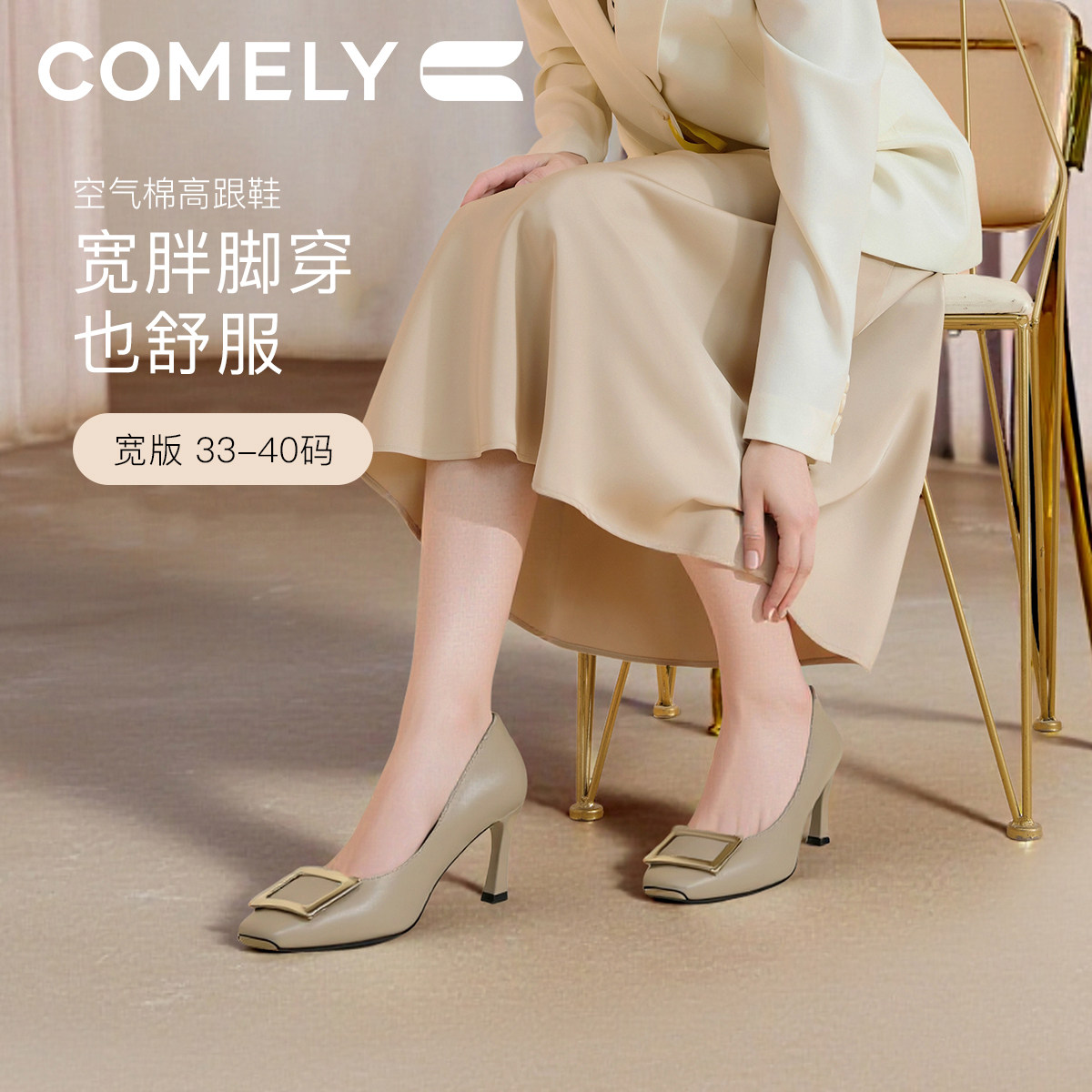 康莉方扣真皮空气棉高跟鞋女宽楦