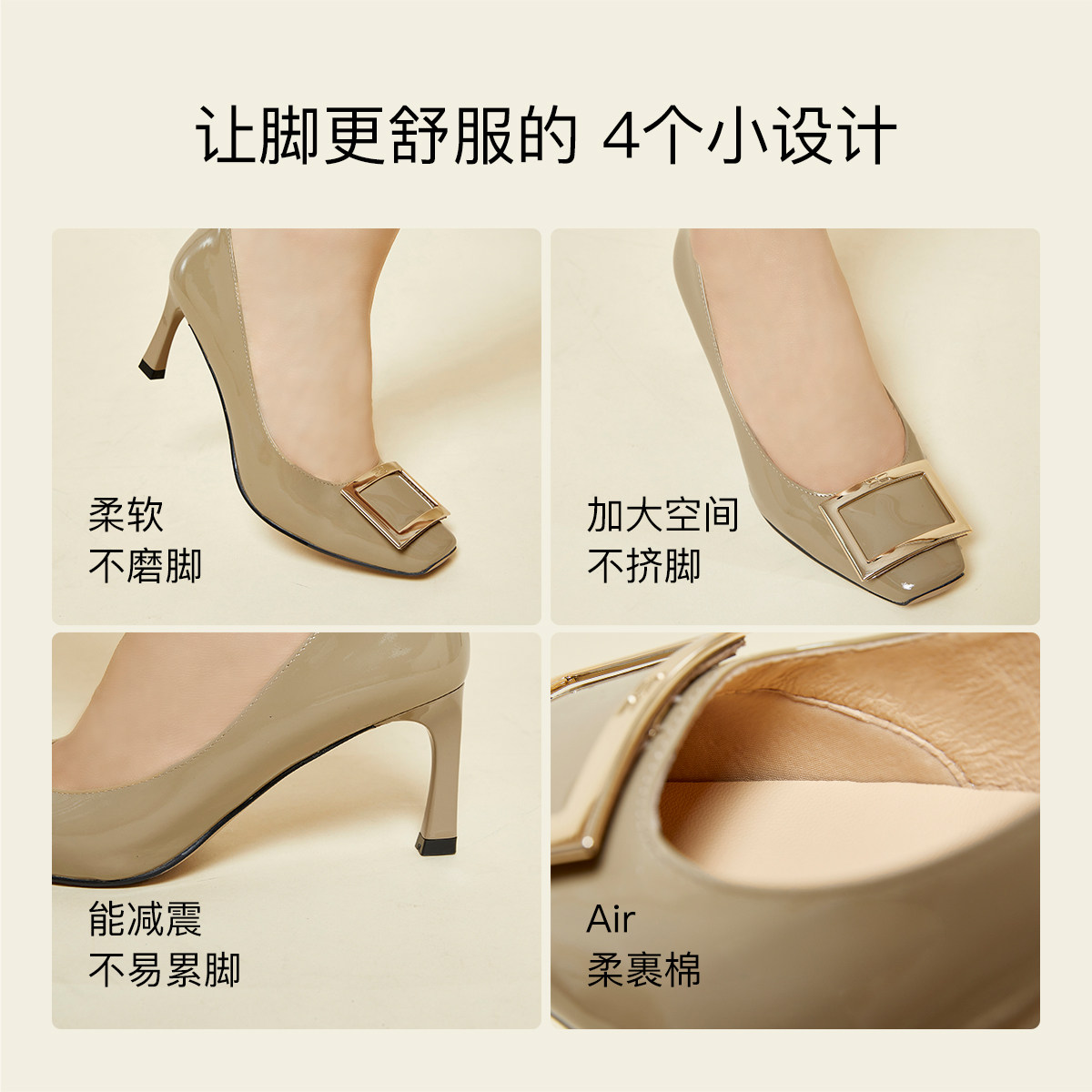 康莉方扣空气棉高跟鞋女细跟2025年秋季新款真皮气质浅口黑色单鞋