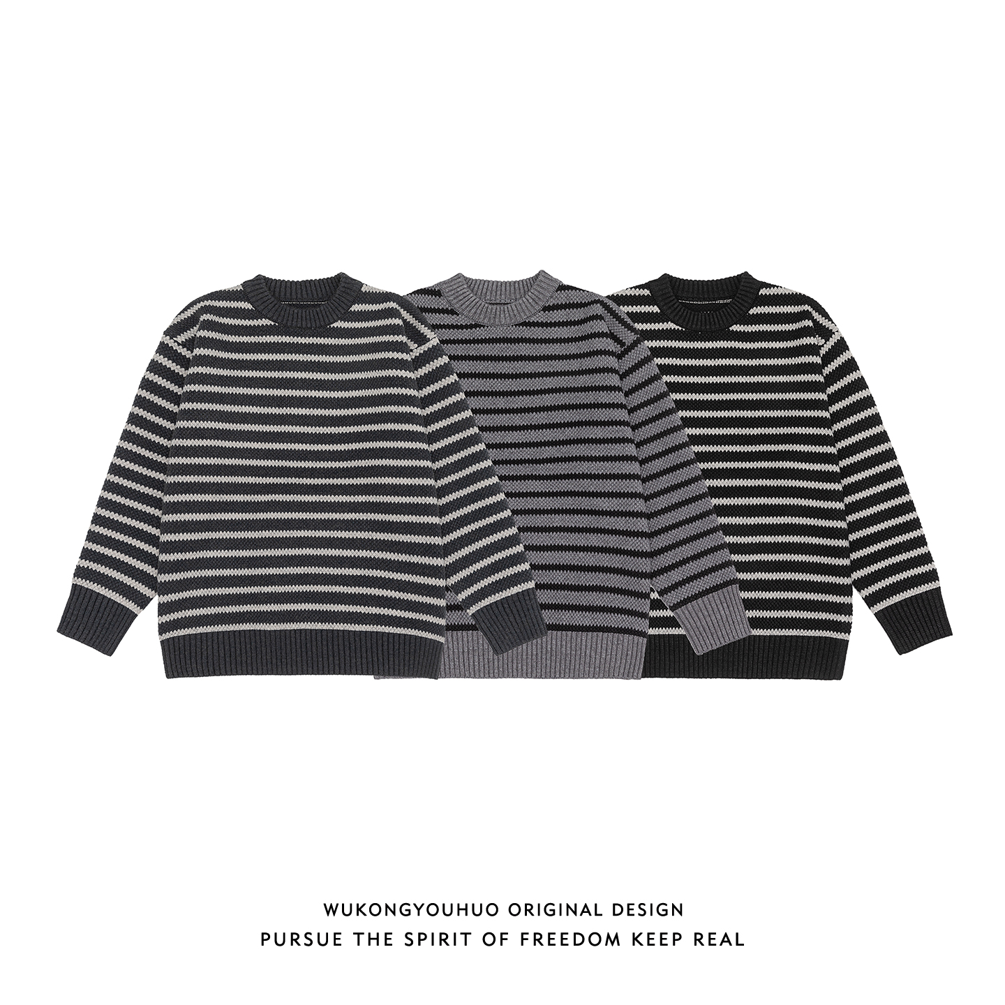 悟空有货美式街头撞色条纹圆领针织衫男潮牌宽松情侣休闲百搭毛衣