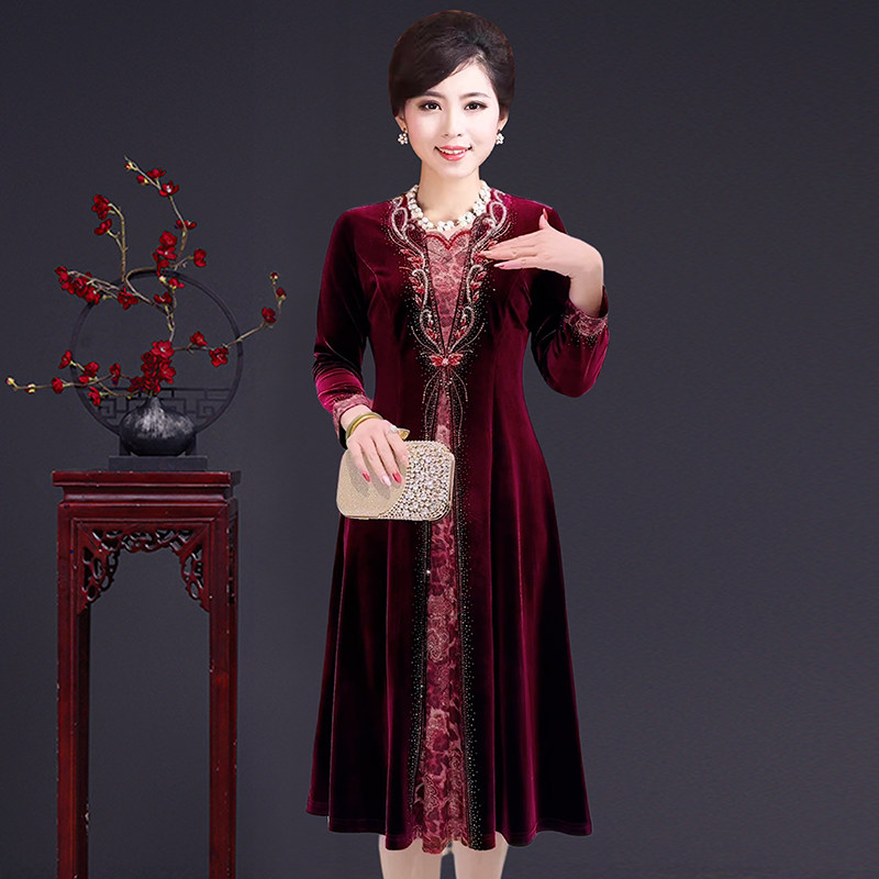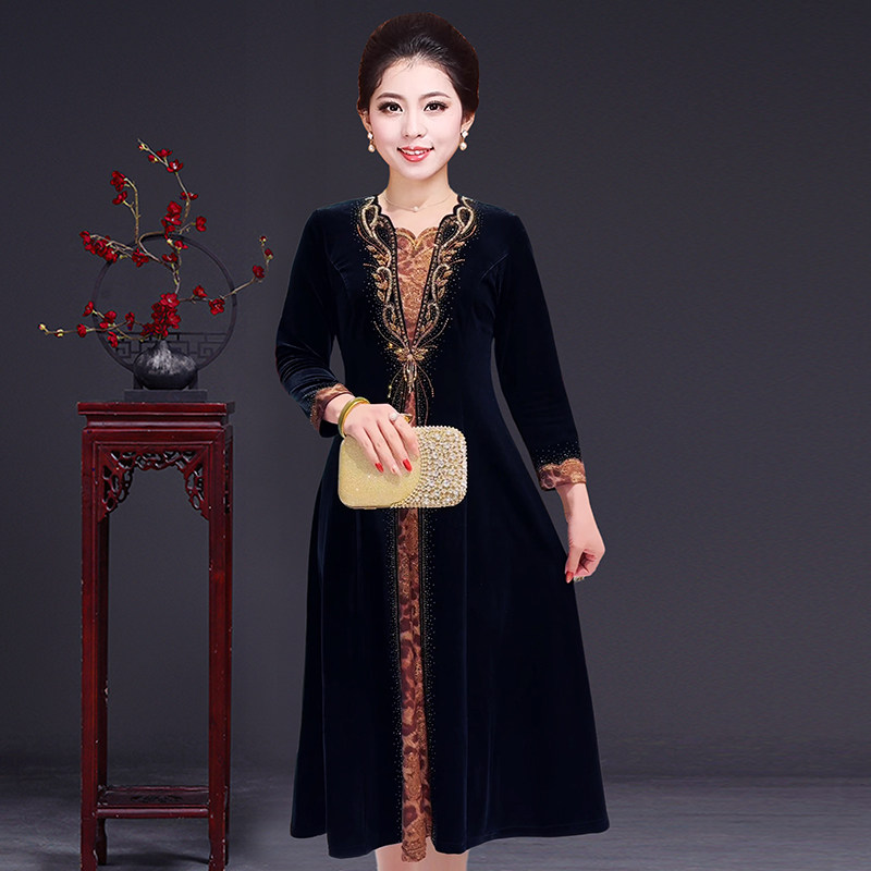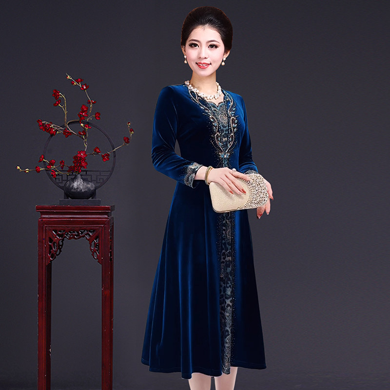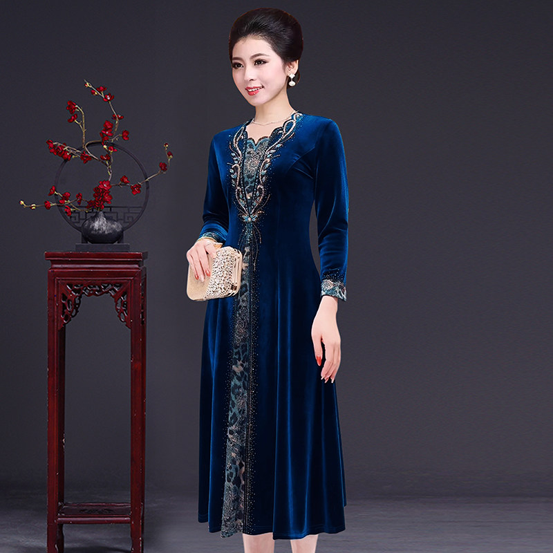 高端中老年女装春秋冬季金丝绒烫钻连衣裙气质妈妈大码显瘦中长款