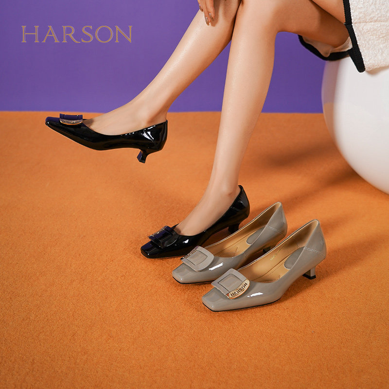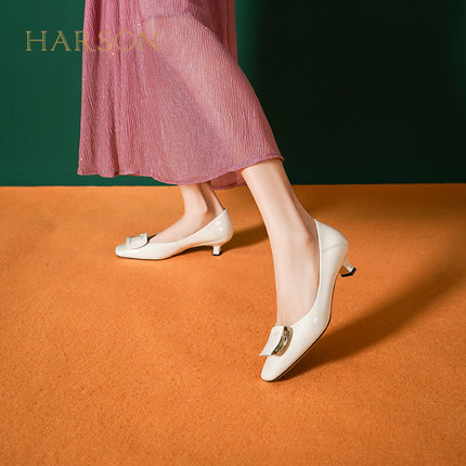 哈森春季新款时尚通勤粗跟方扣尖头女单鞋中跟HWS230132