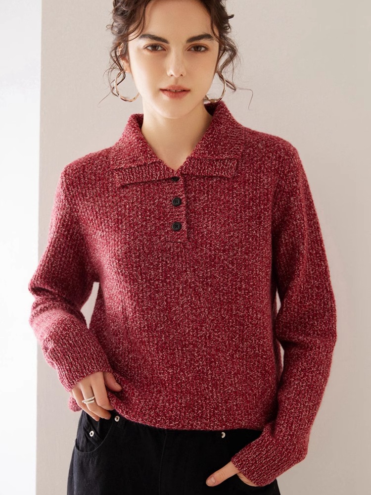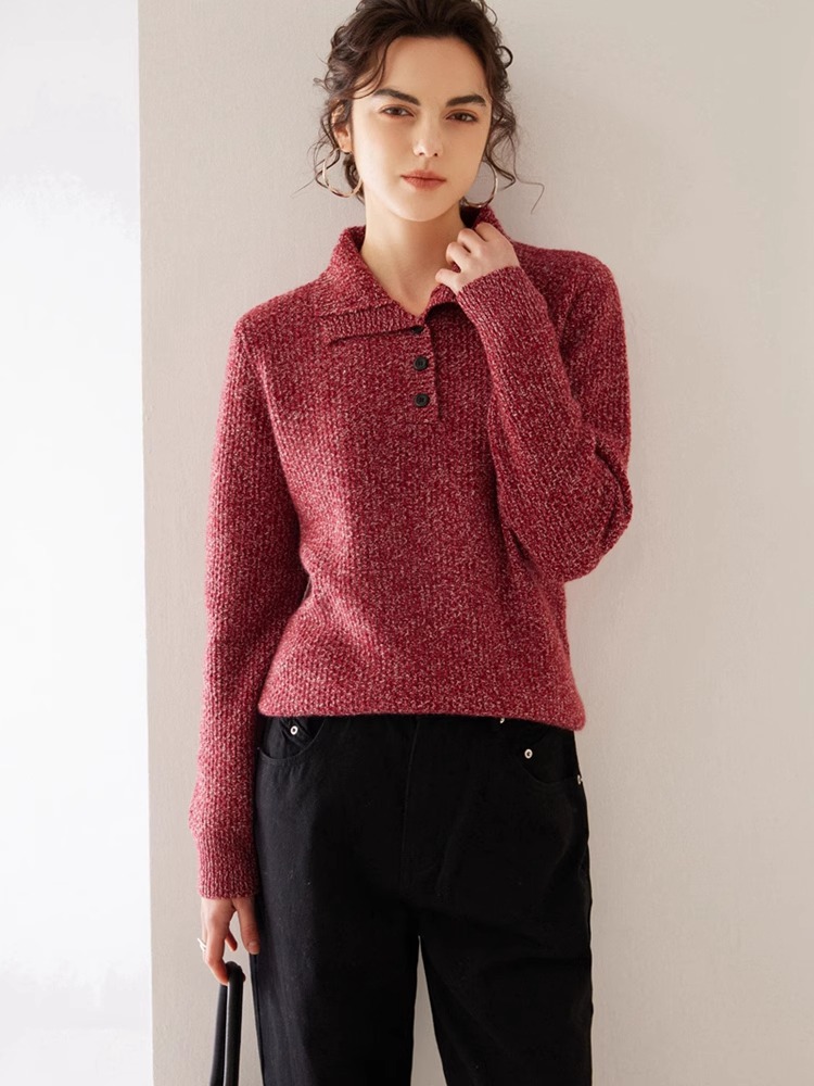 秋冬新款撞色花纱翻领纯山羊绒衫女双股加厚时尚套头毛衣针织衫