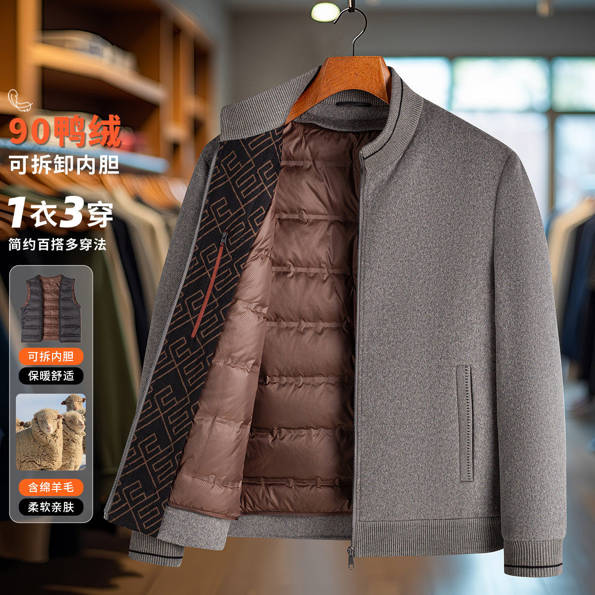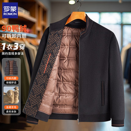 罗蒙羊毛外套秋冬男士可拆可脱卸内胆羽绒服背心立领夹克毛呢大衣