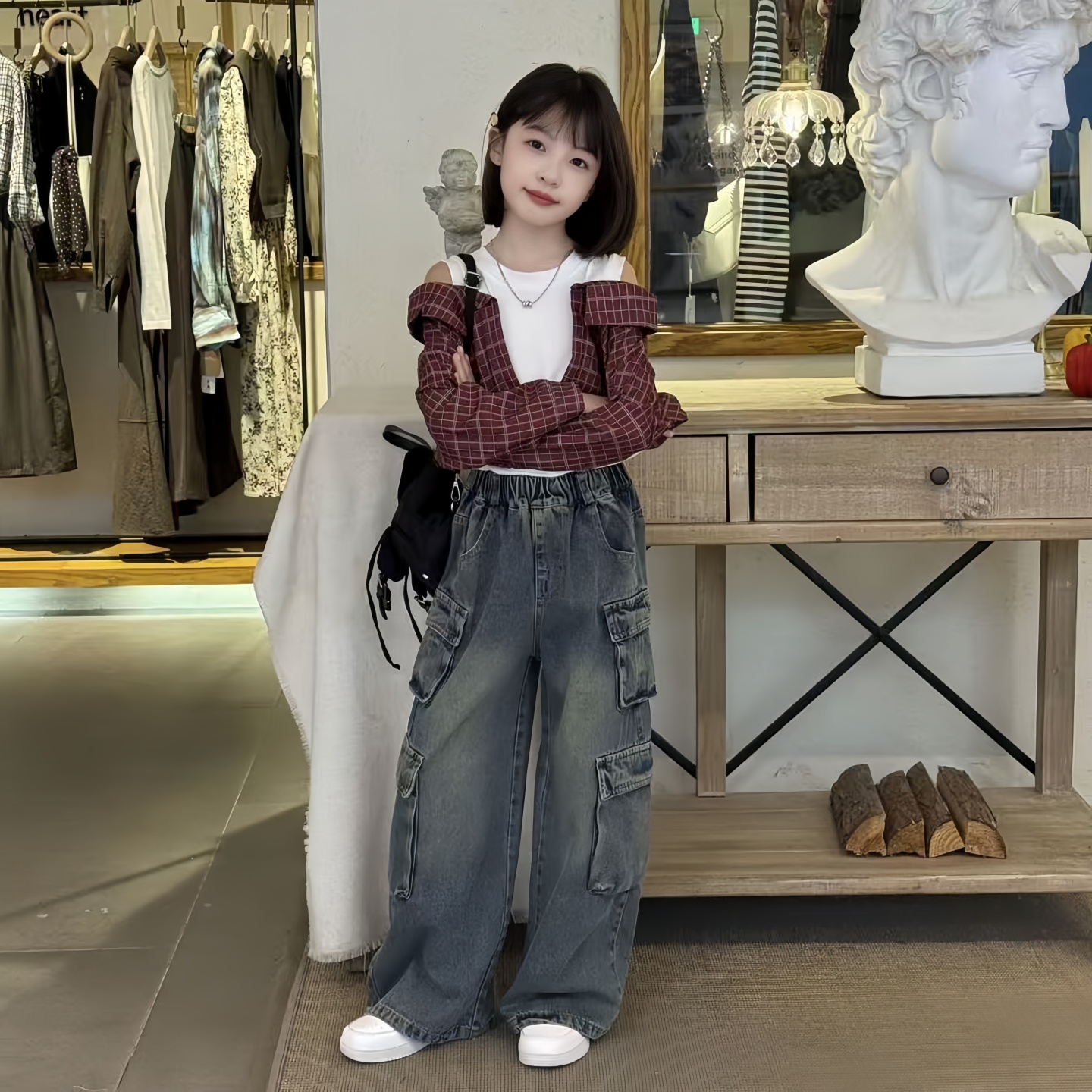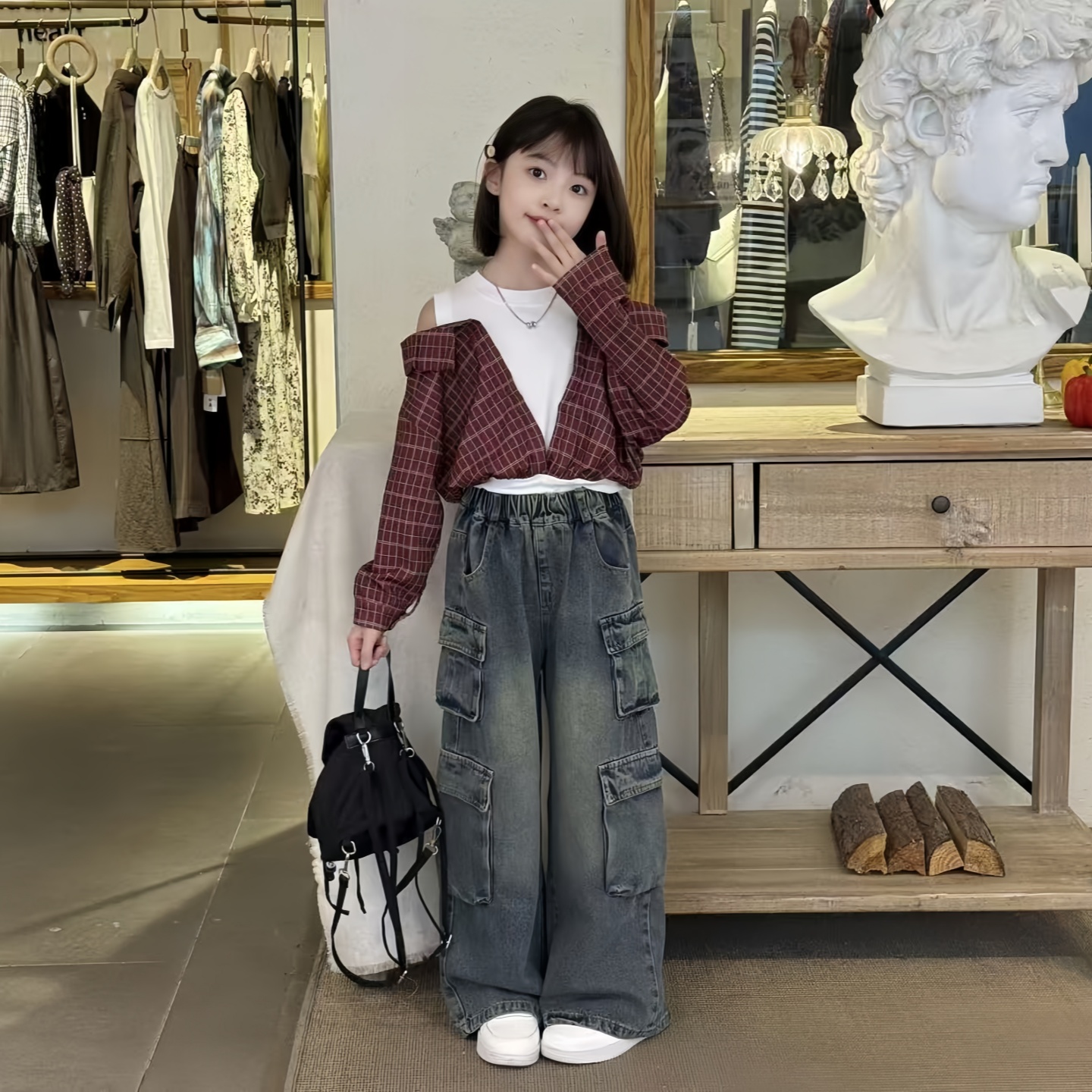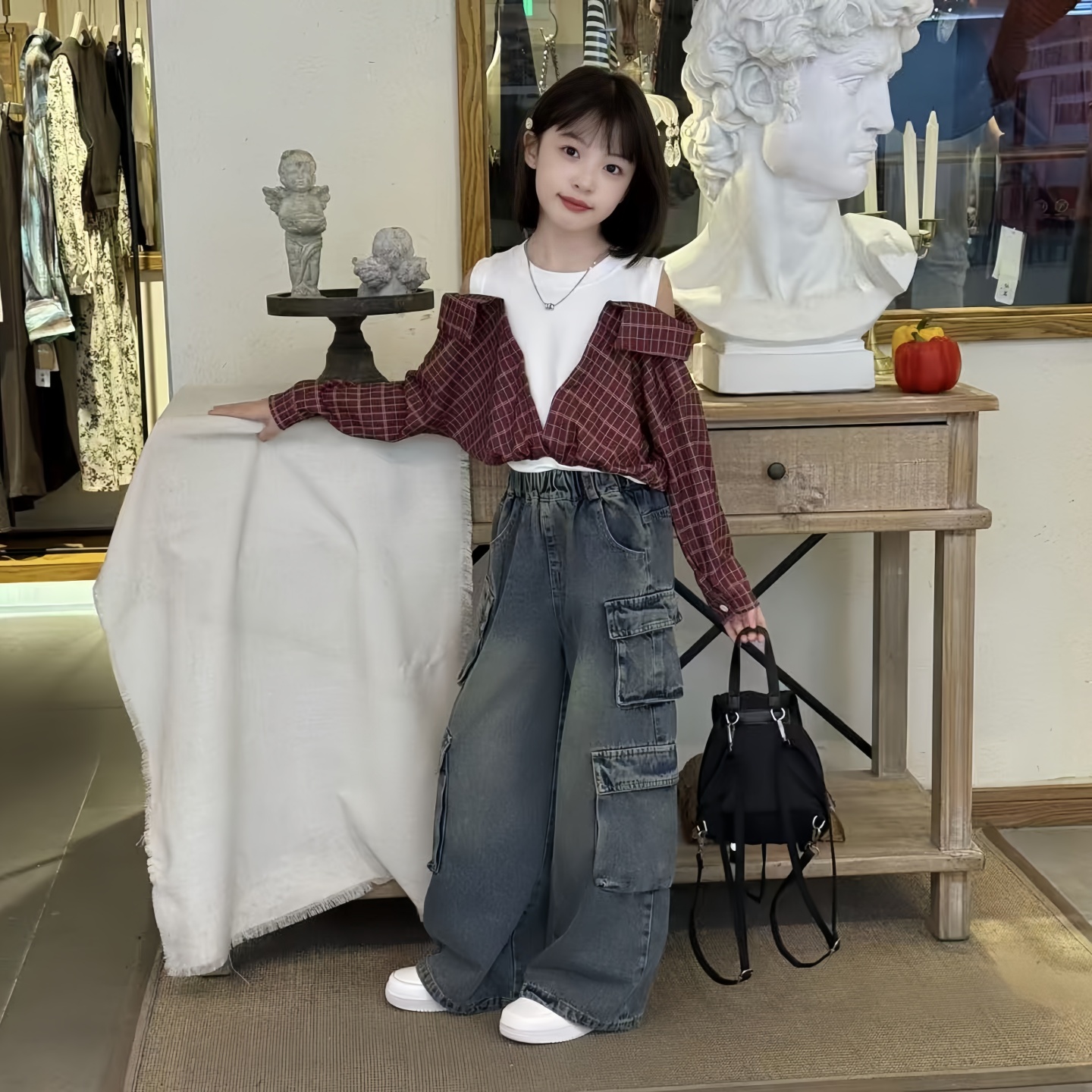 女童撞色拼接圆领露肩格子衬衫秋季新款洋气潮酷工装牛仔裤两件套