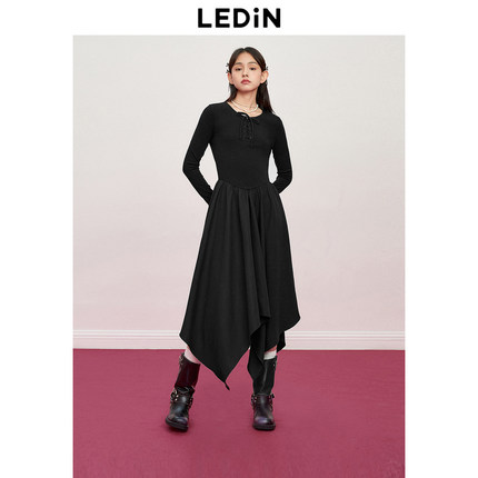 【清仓】乐町针织打底小黑裙秋精致抽绳不规则设计显瘦显高连衣裙