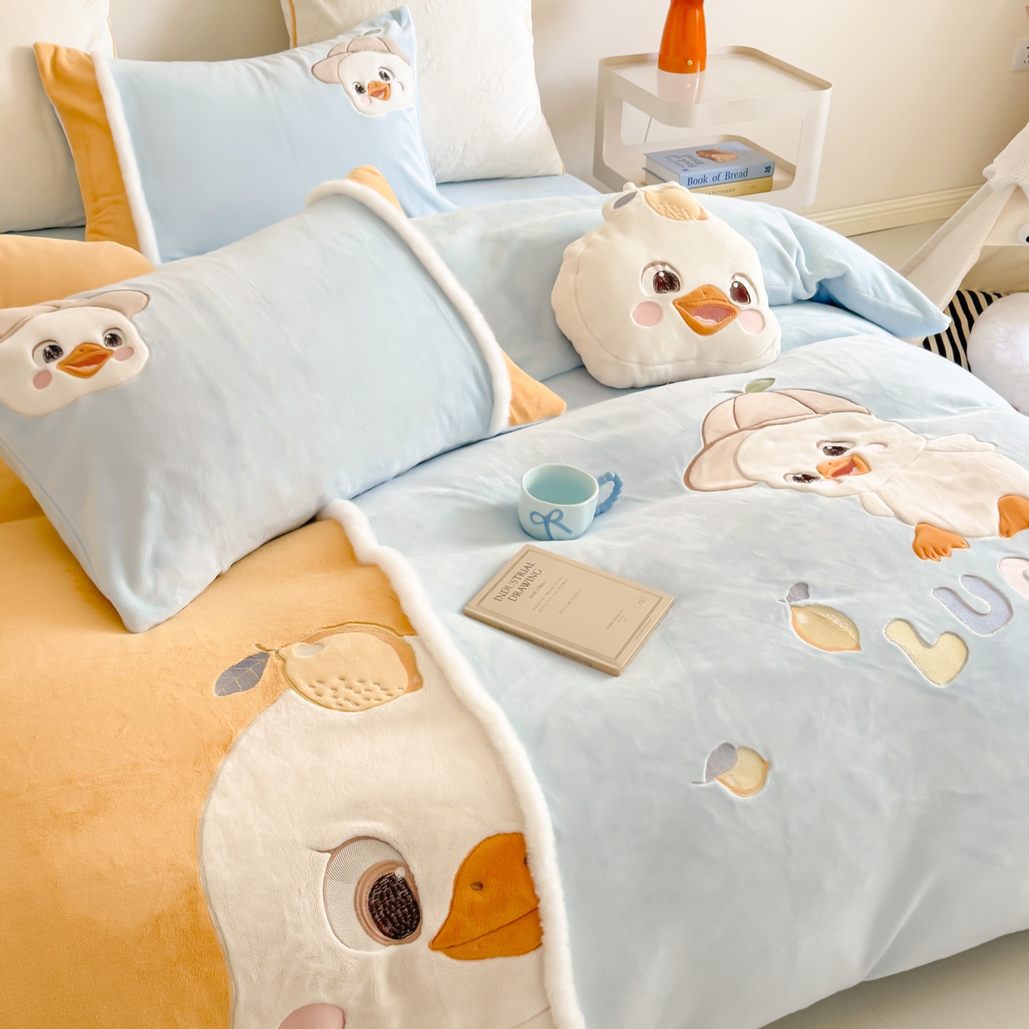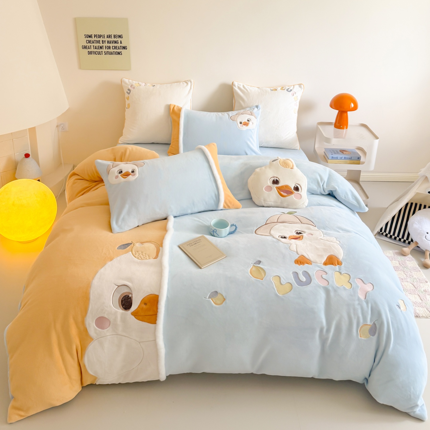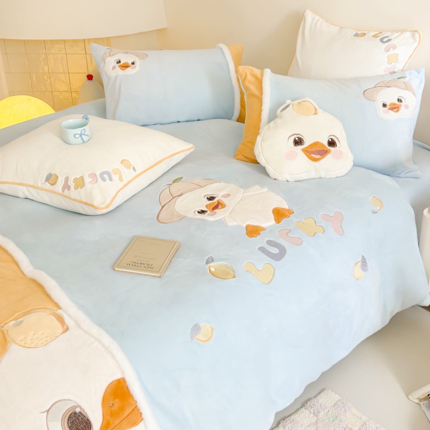 可爱小鸭子牛奶绒四件套冬季加厚珊瑚绒卡通风刺绣少女心儿童床品