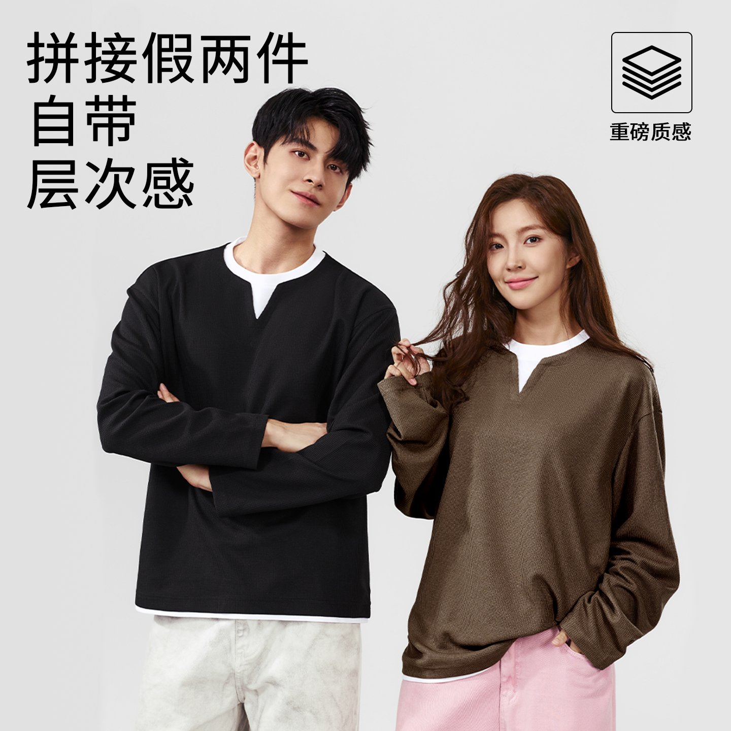 班尼路S&K美式复古V领假两件长袖t恤男秋季宽松男士华夫格打底衫A