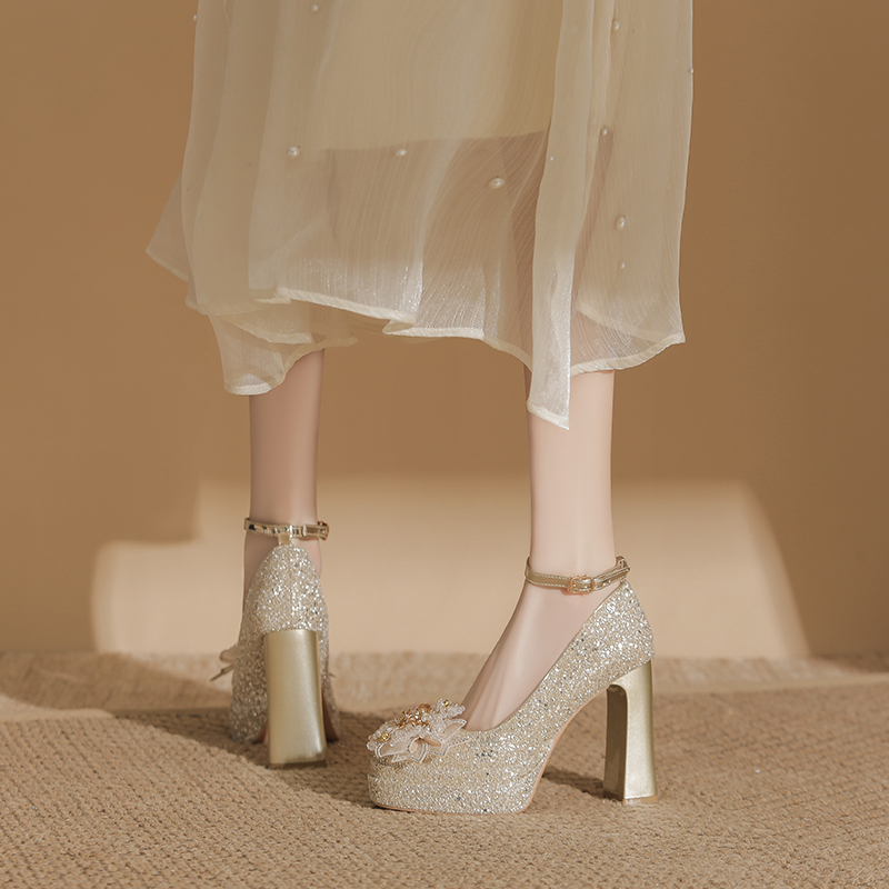 粗跟厚底玛丽珍女鞋防水台水晶高跟鞋不累脚主订婚纱鞋神器新娘鞋