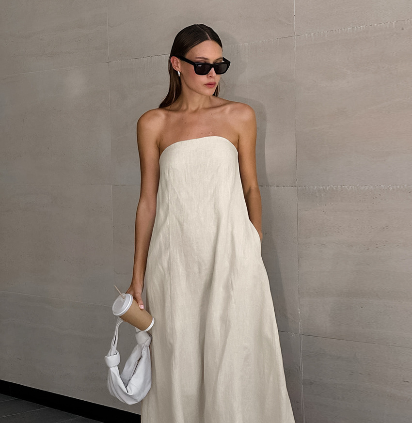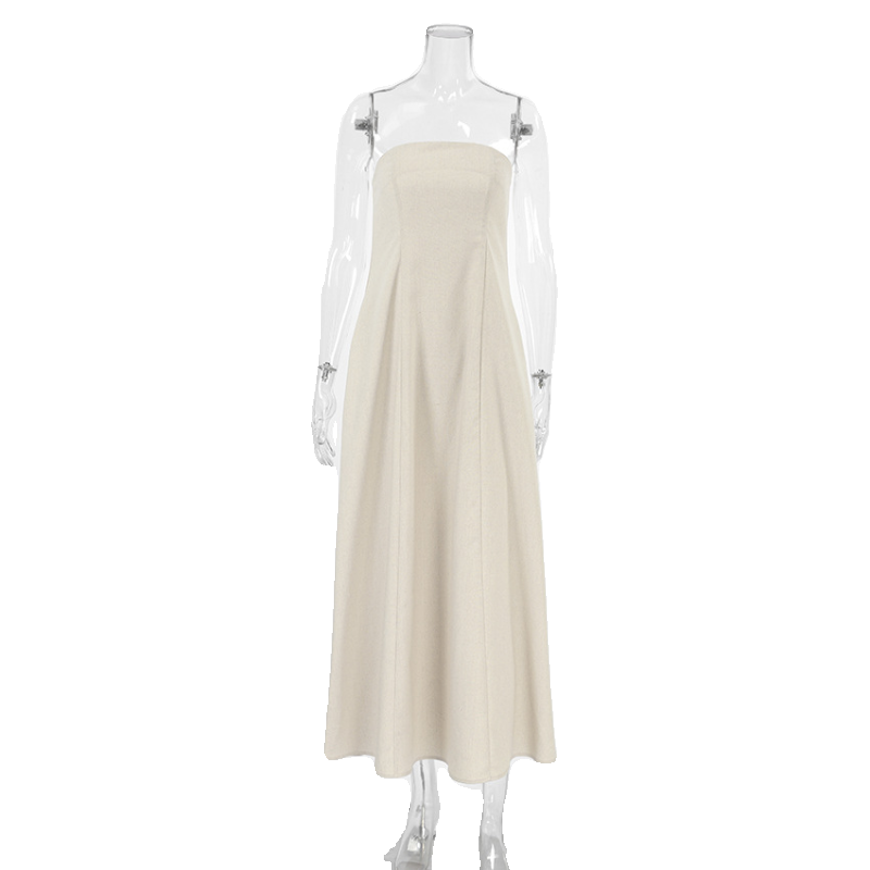 法式度假风棉麻抹胸高腰连衣裙2024春季新款休闲纯色露背拼接长裙