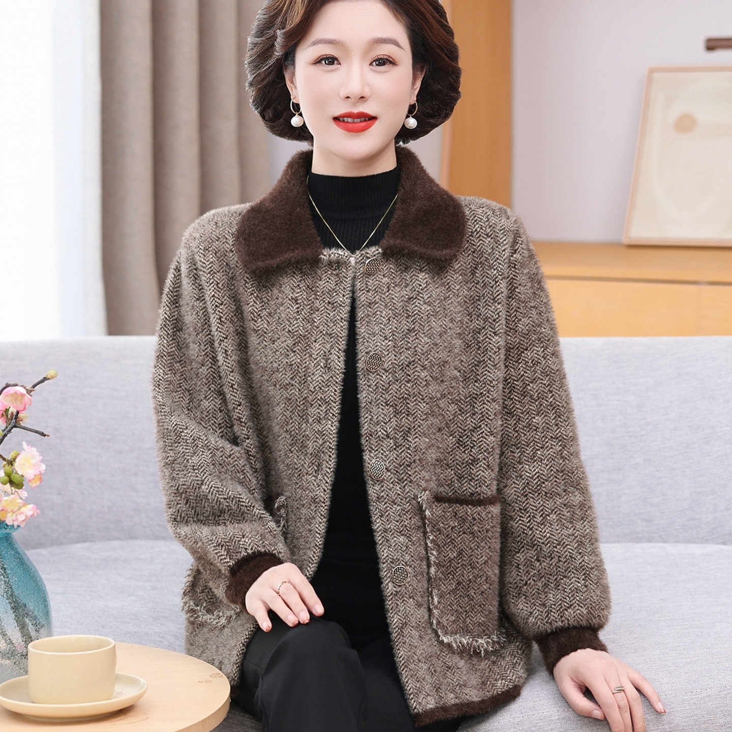 妈妈秋装时尚翻领毛呢上衣中老年女秋冬季加厚呢子外套水貂绒大衣