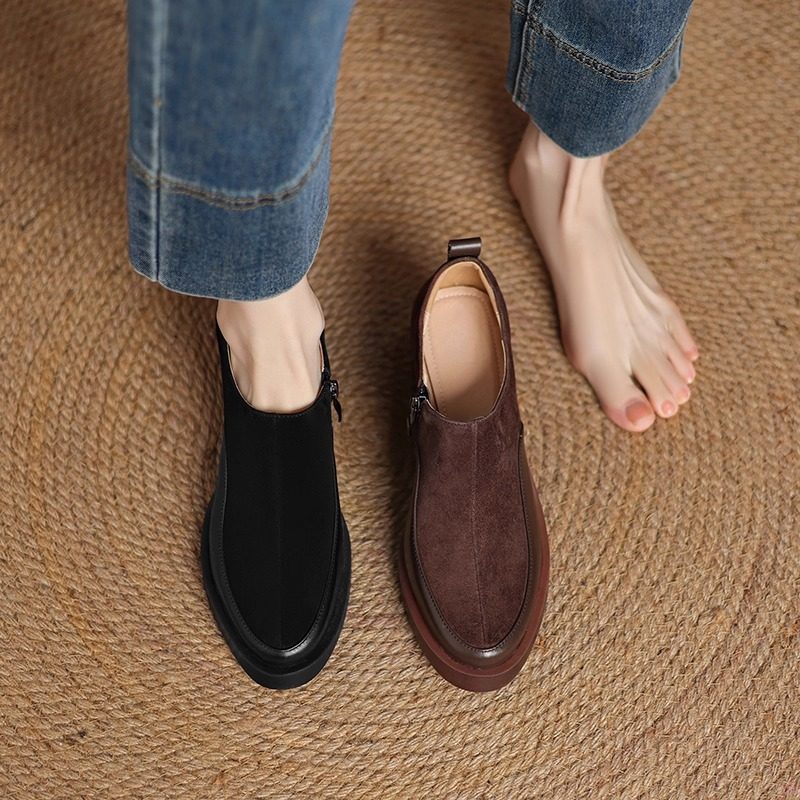 英伦复古真皮深口单鞋女粗跟圆头侧拉链舒适小皮鞋通勤厚底乐福鞋