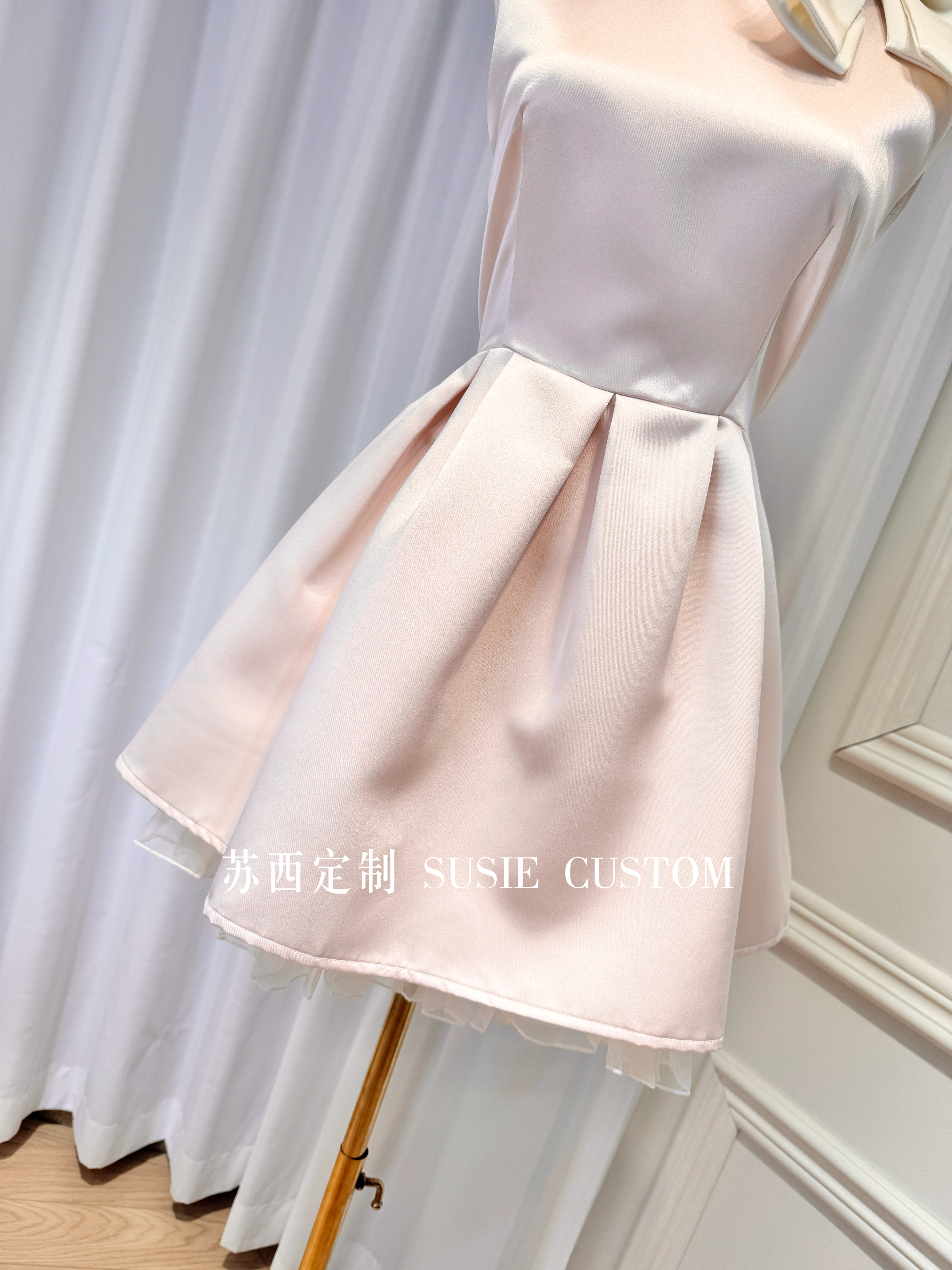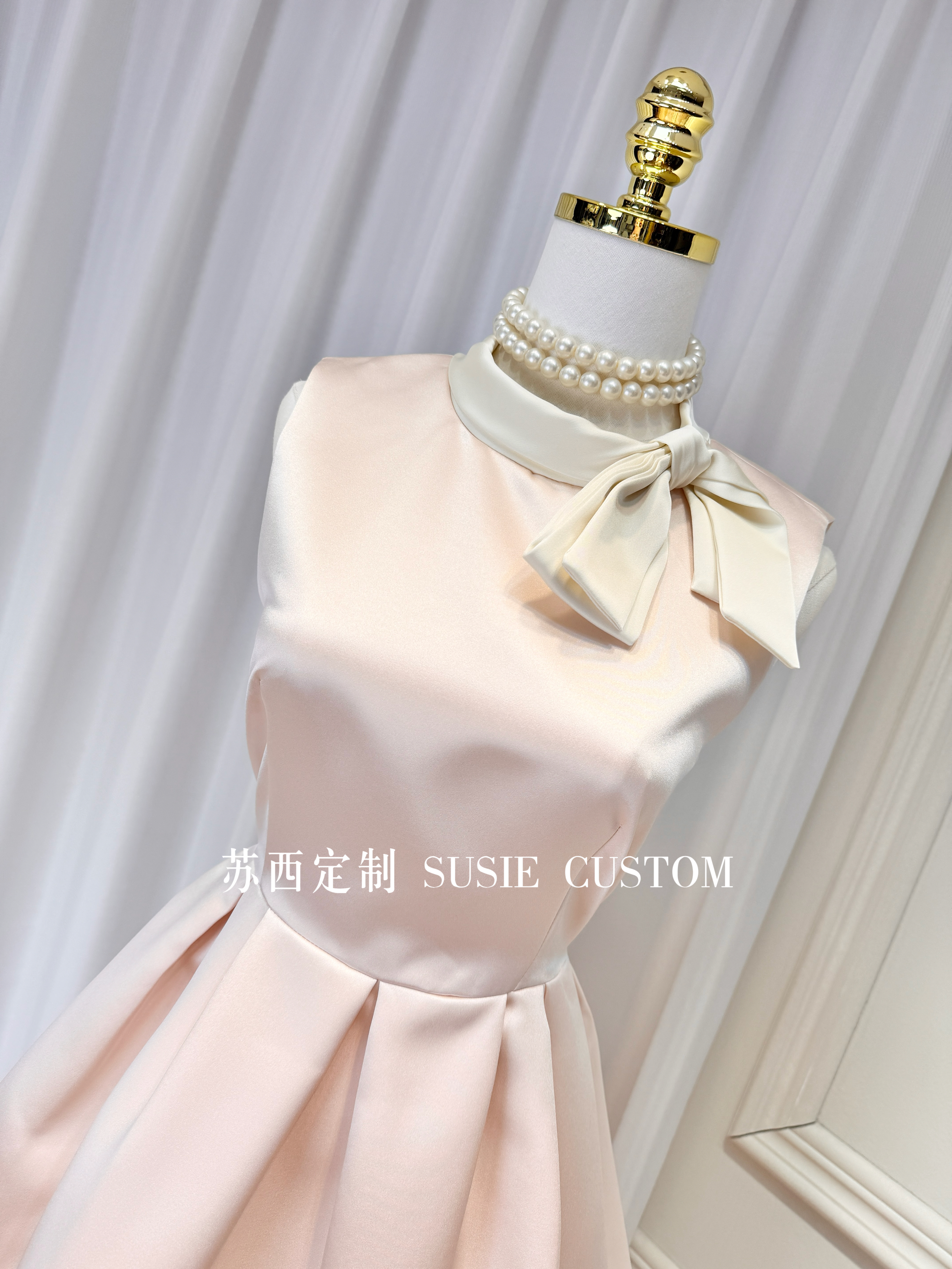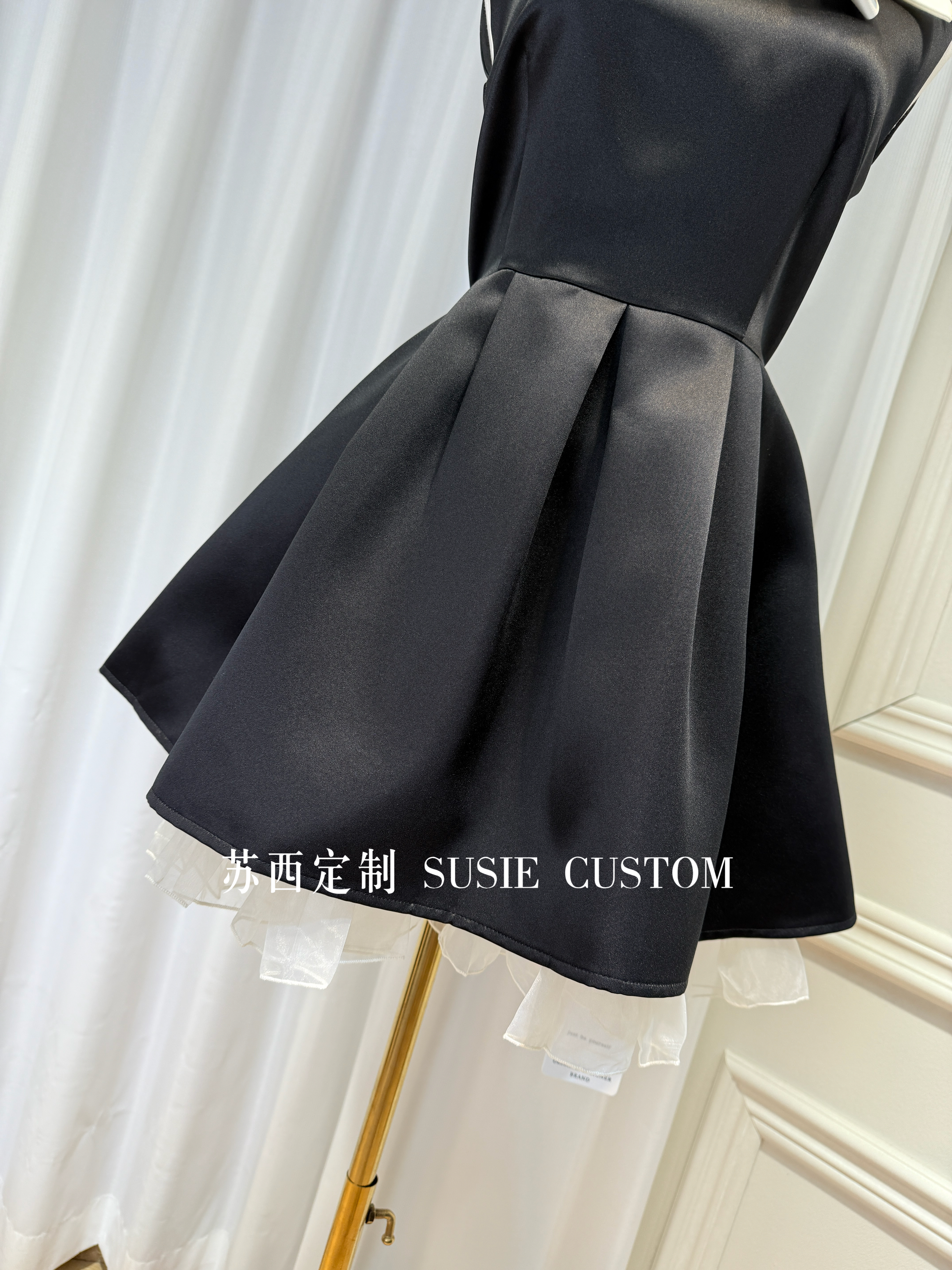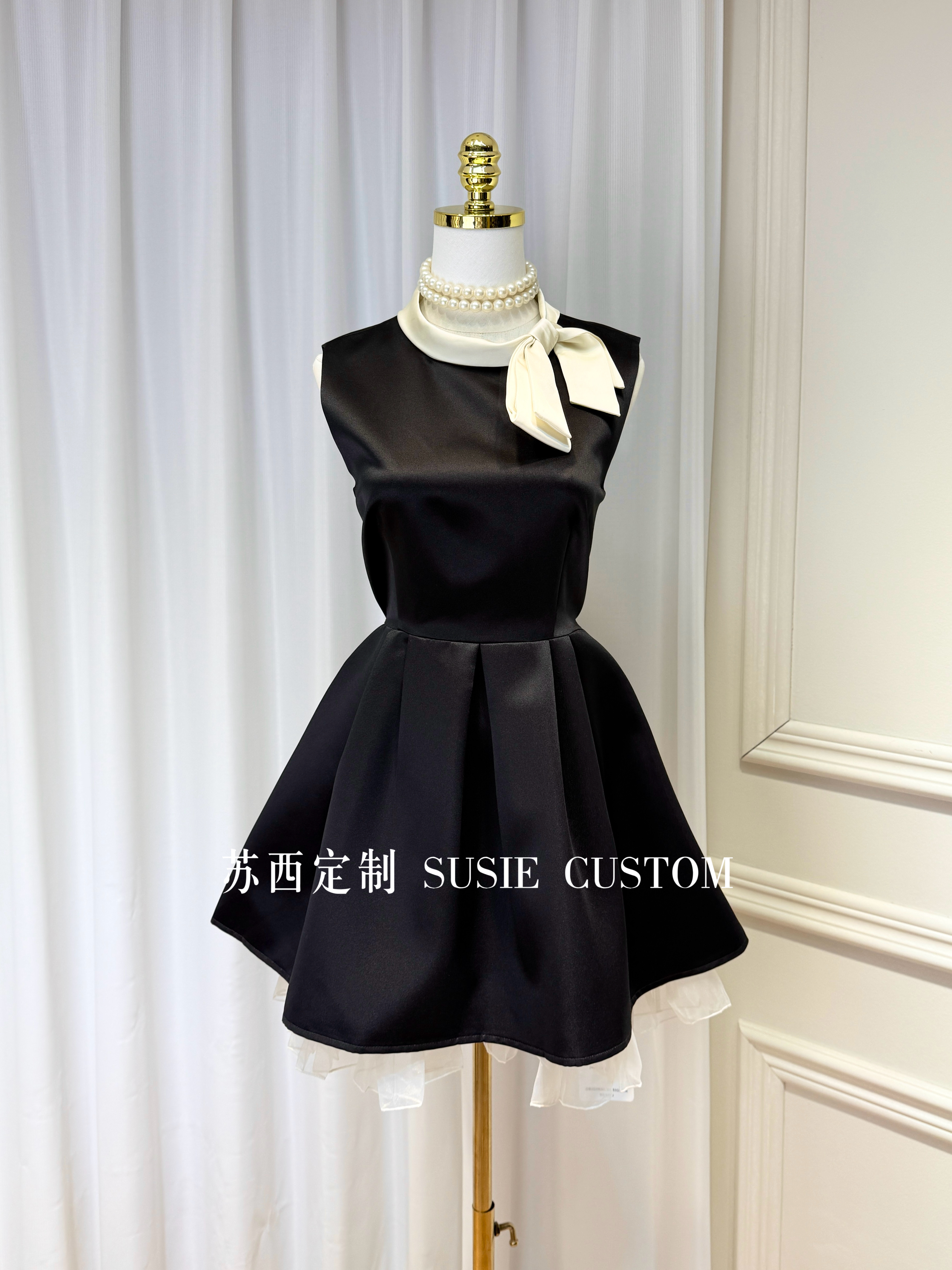 小众设计款蝴蝶结立领无袖背心收腰网纱边缎面蓬蓬裙生日礼服裙