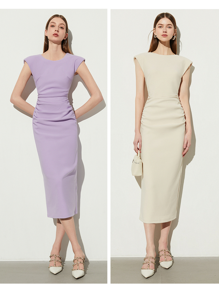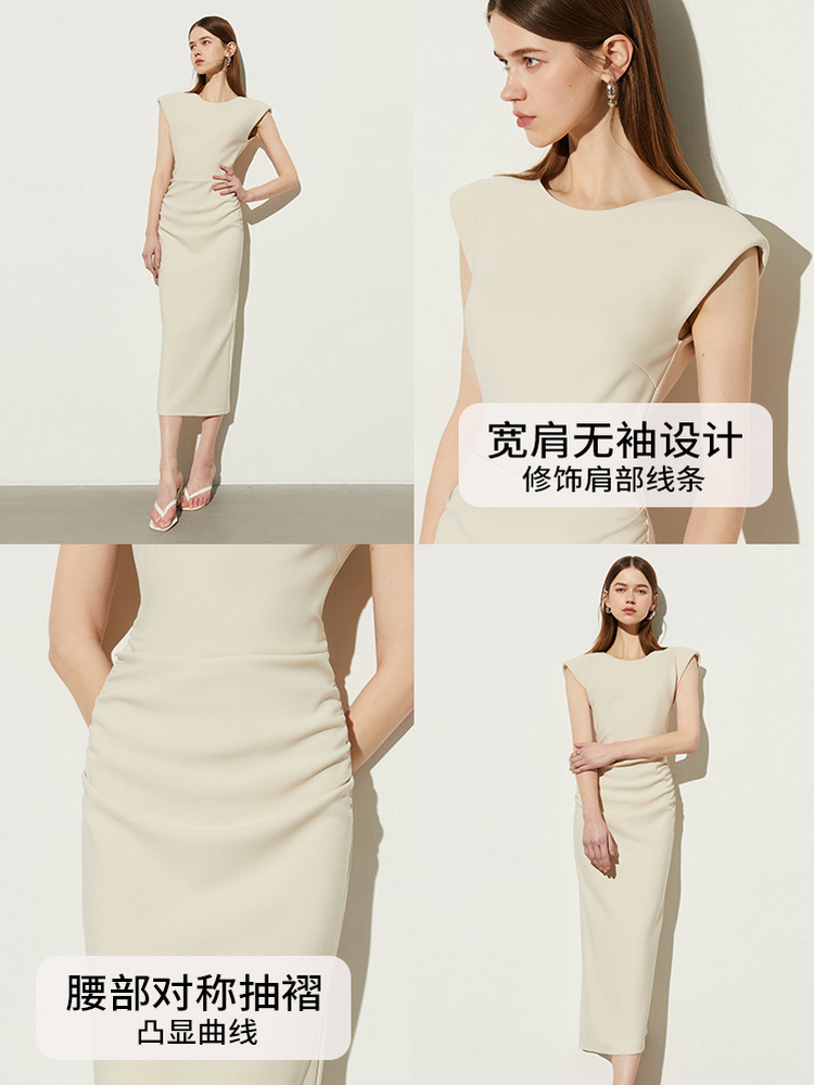 DPLAY2025夏季白色连衣裙法式垫肩连衣裙收腰修身长裙气质连衣裙