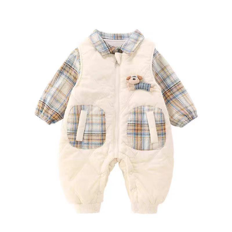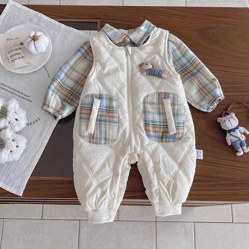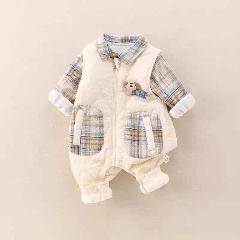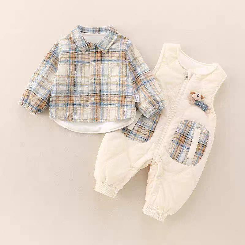 婴幼儿秋冬季宝宝加绒格子衬衫夹棉背带裤冬季男童套装分体两件套
