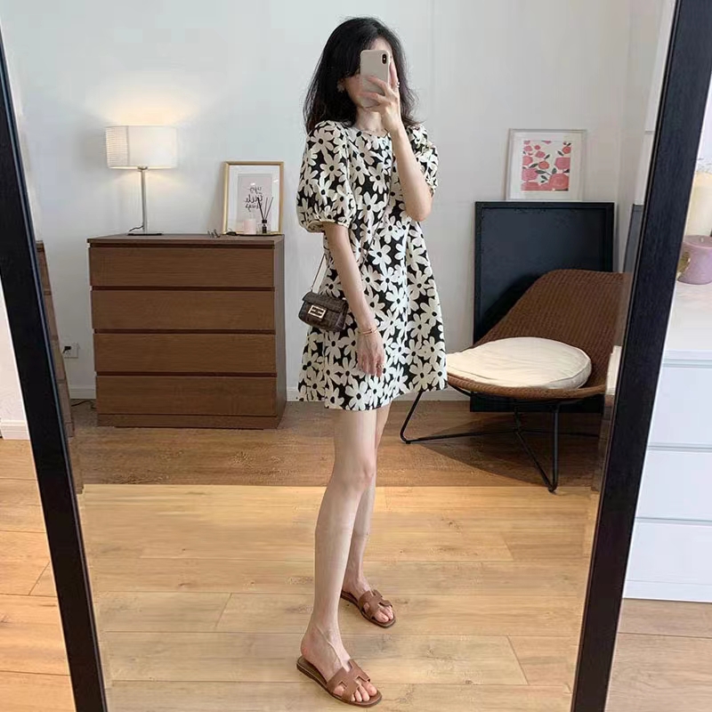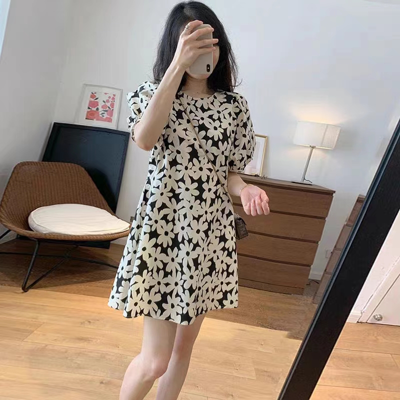 哺乳期连衣裙夏季雪纺时r尚碎花泡泡袖小个M子外出辣妈款喂奶裙子