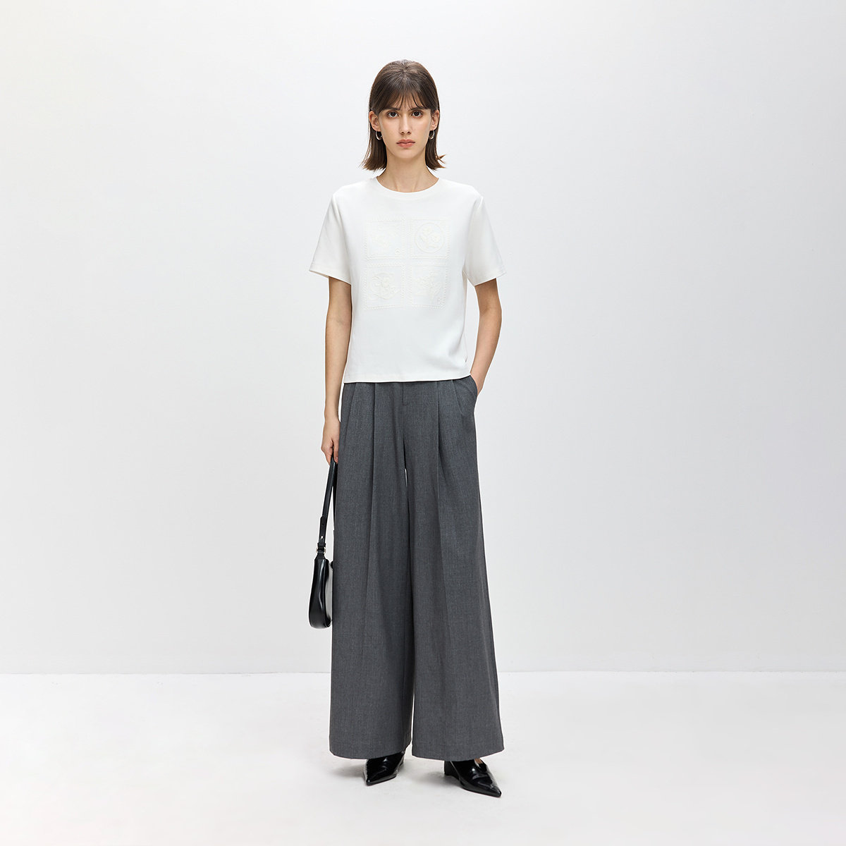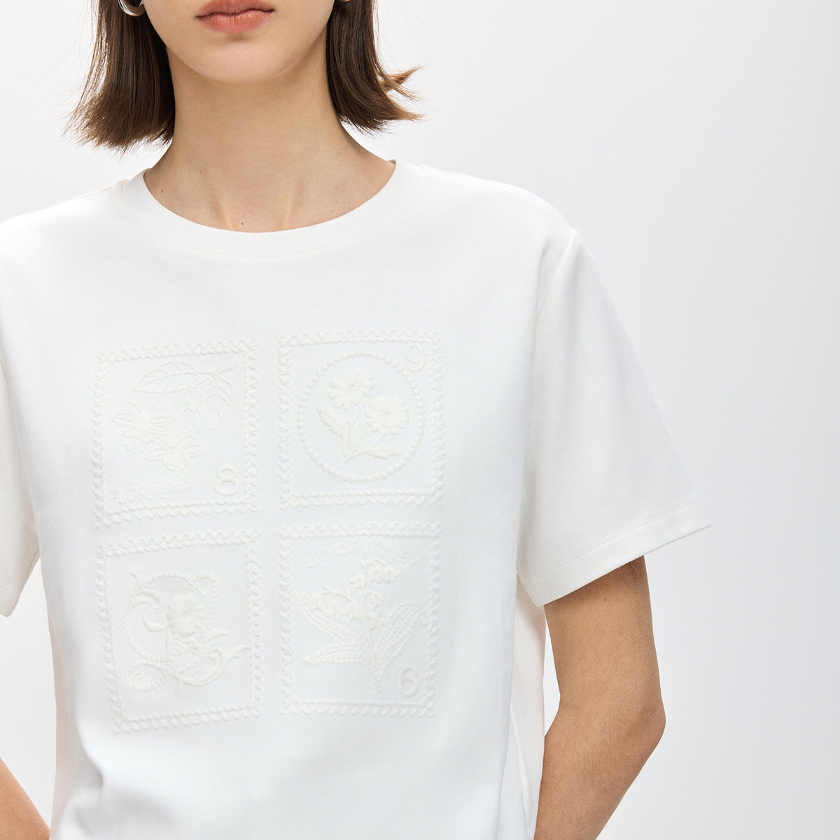 LILY2026春新款女装欧若风邮票图案刺绣圆领休闲通勤白色短袖T恤