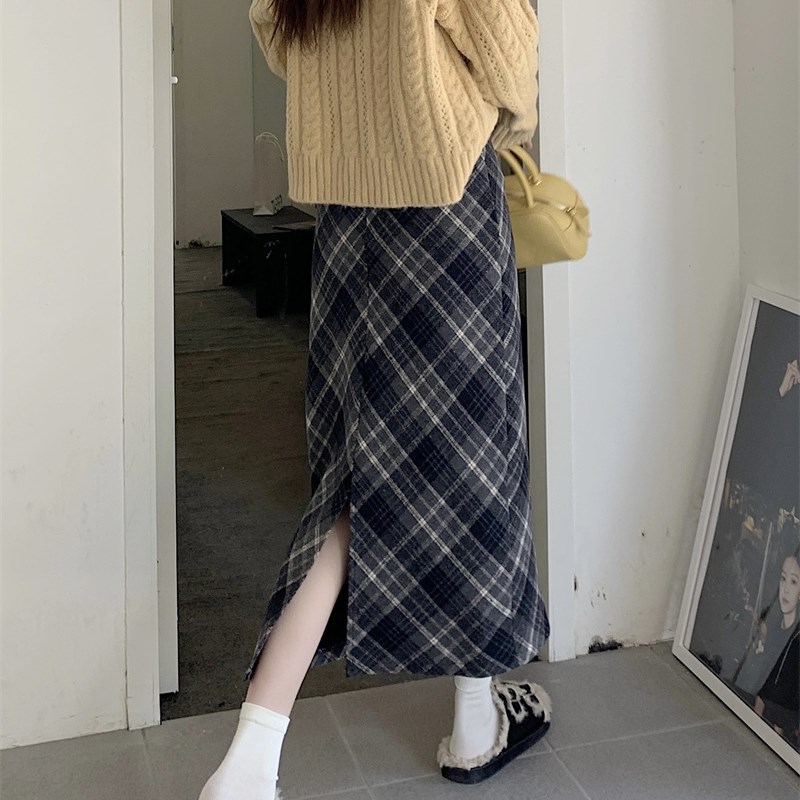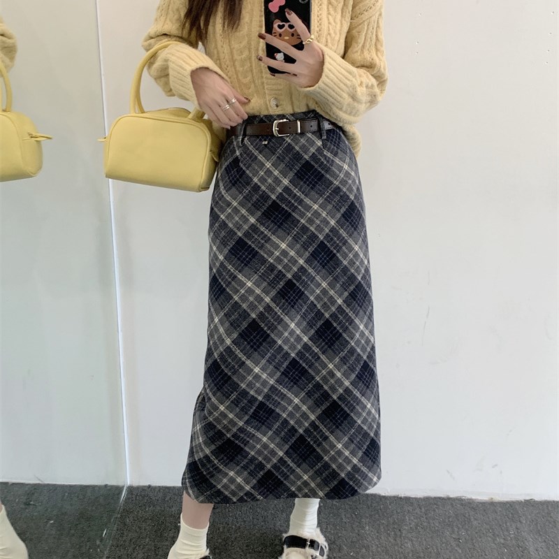 格纹毛呢半身裙秋冬配毛衣高腰大码中长款包臀a字裙开叉格子长裙