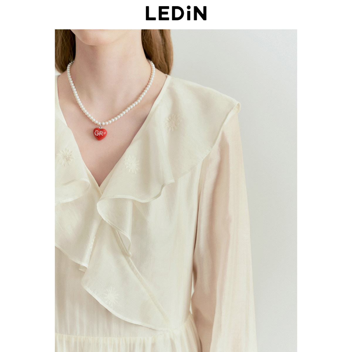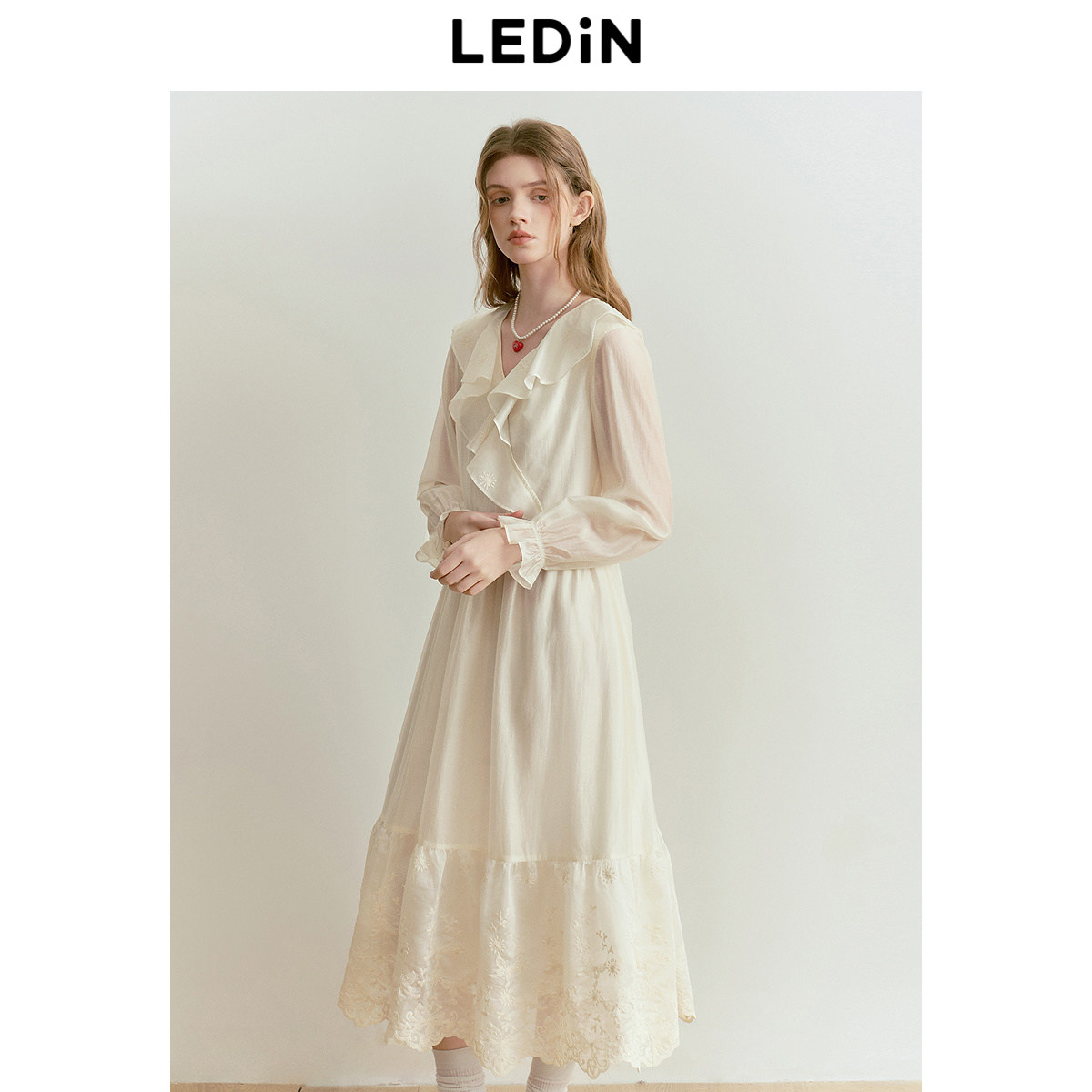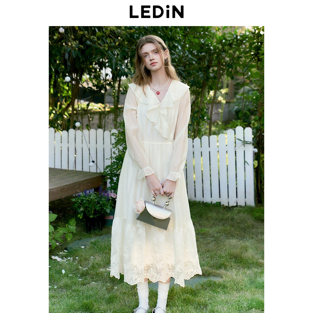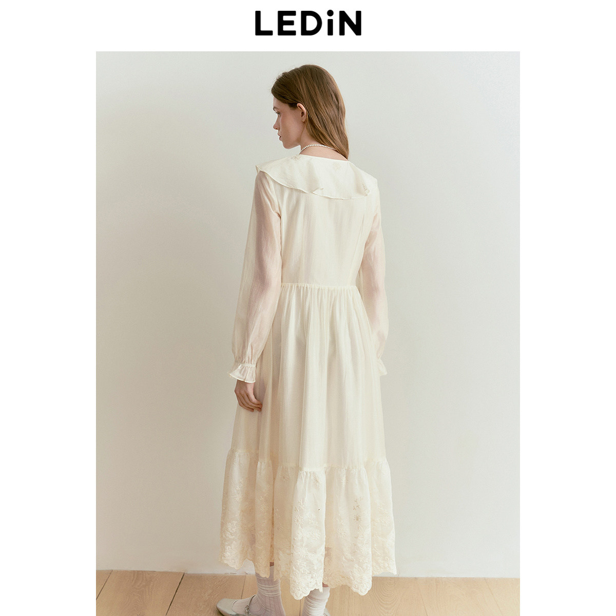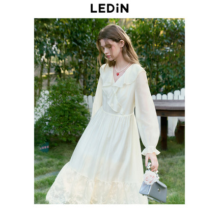 乐町花边领设计连衣裙25年春季新款重工天丝拼接长袖裙大裙摆长裙