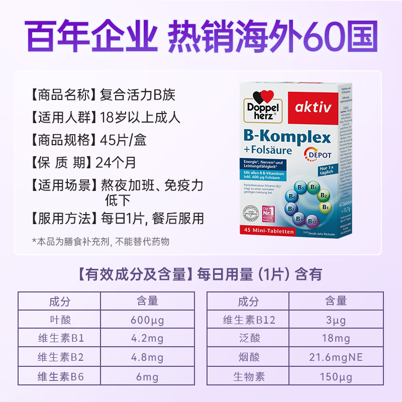 【自营】德国双心多种b族复合维生素片7降低男女士生物素皮质醇*3
