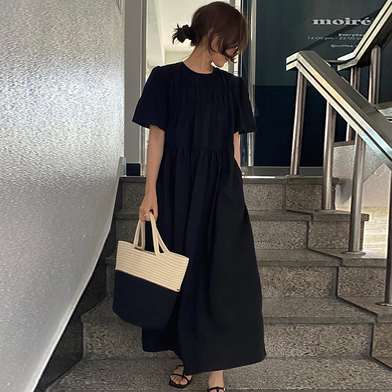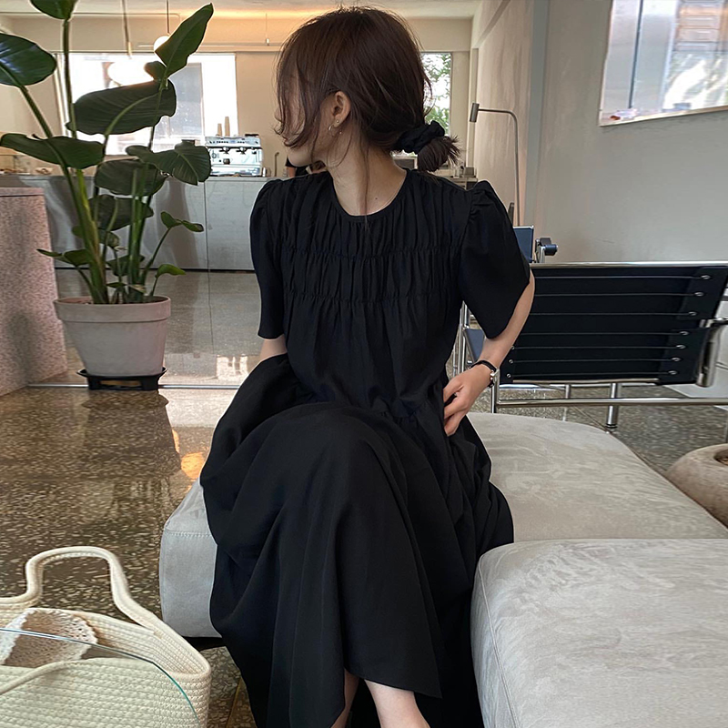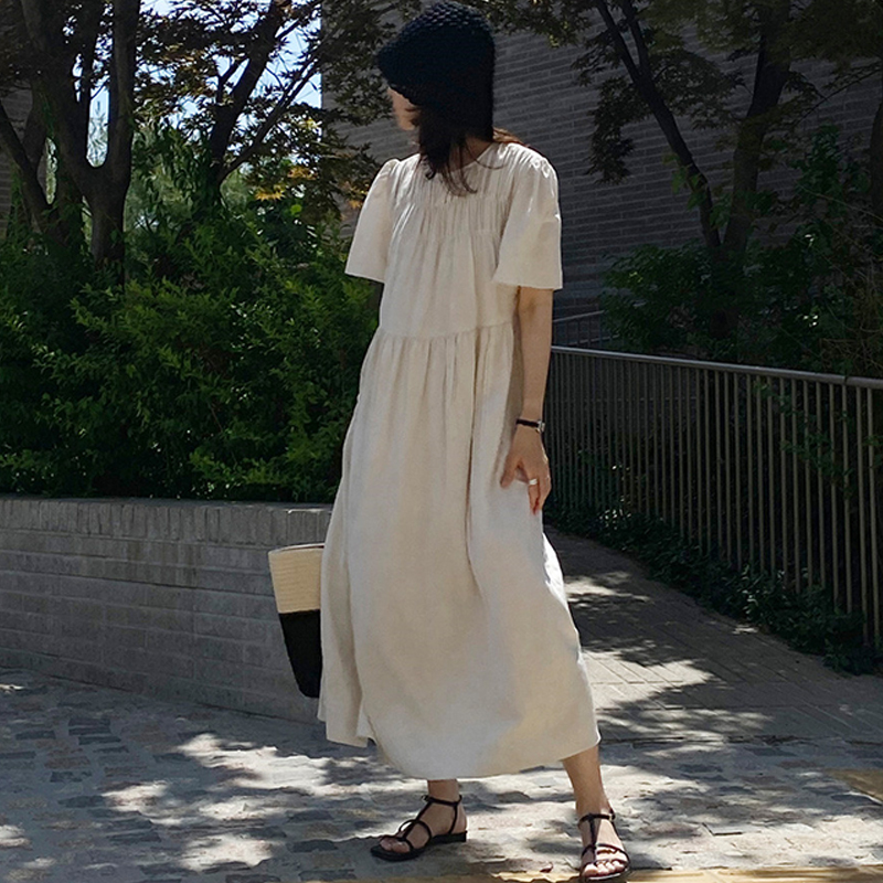 韩国chic夏季简约气质圆领褶皱感高腰显瘦泡泡袖棉麻长款连衣裙女
