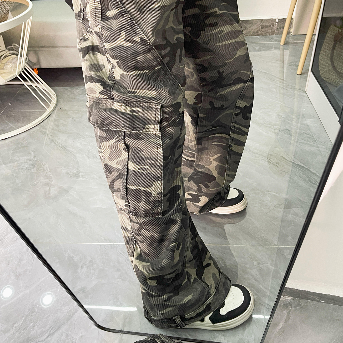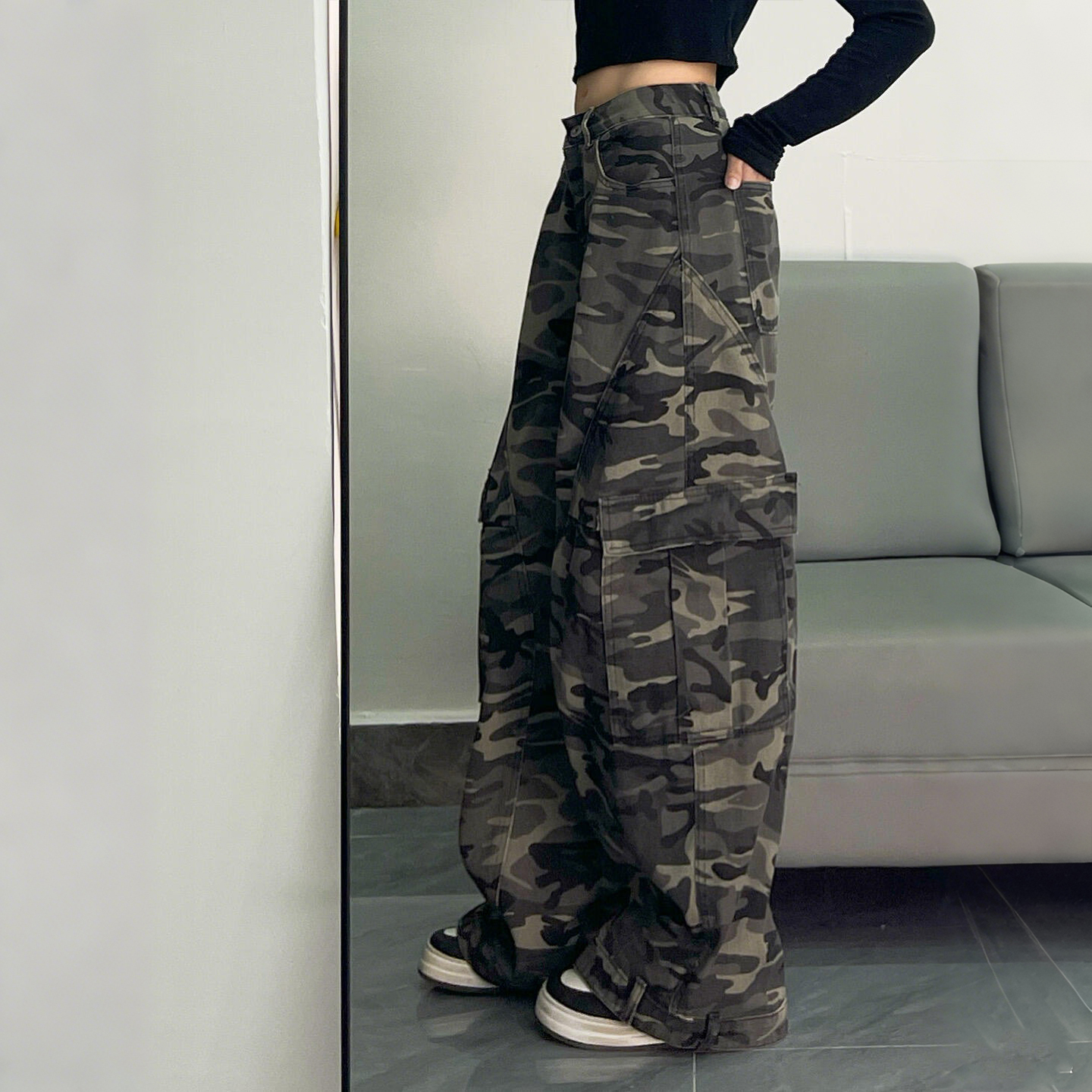 300斤胖mm大码美式复古迷彩工装牛仔裤女宽松显瘦直筒阔腿拖地裤