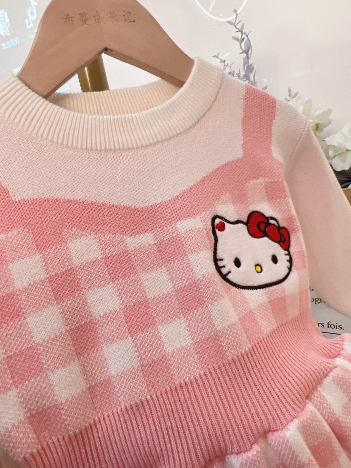 原创2025春秋新款女童粉格子洋气假两件甜美针织裙可爱猫咪连衣裙